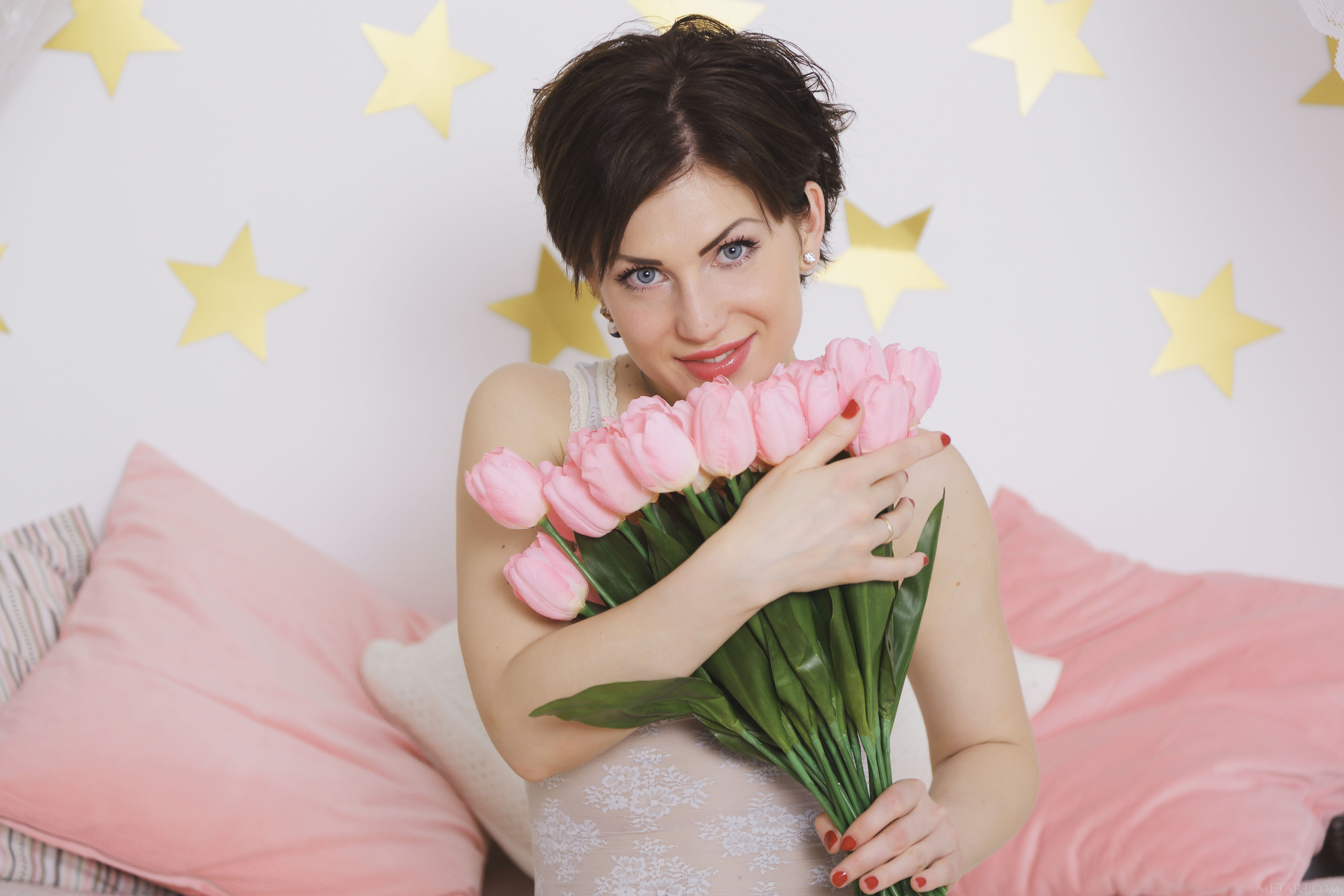 sasha bree, brunette, sexy girl, adult model, flowers, smile, tulips