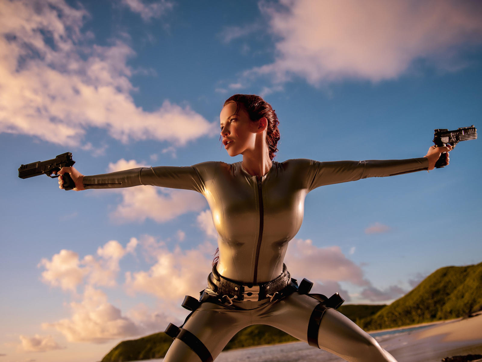 bianca beauchamp, canadian, model, redhead, sexy babe, fetishqueen, cosplay, lara croft, tomb raider, beach, sand, water, wet, latex, catsuit, decollete, queue, pistols, rubber, fetish, tomb raider set, bianca, girls and guns, fetish