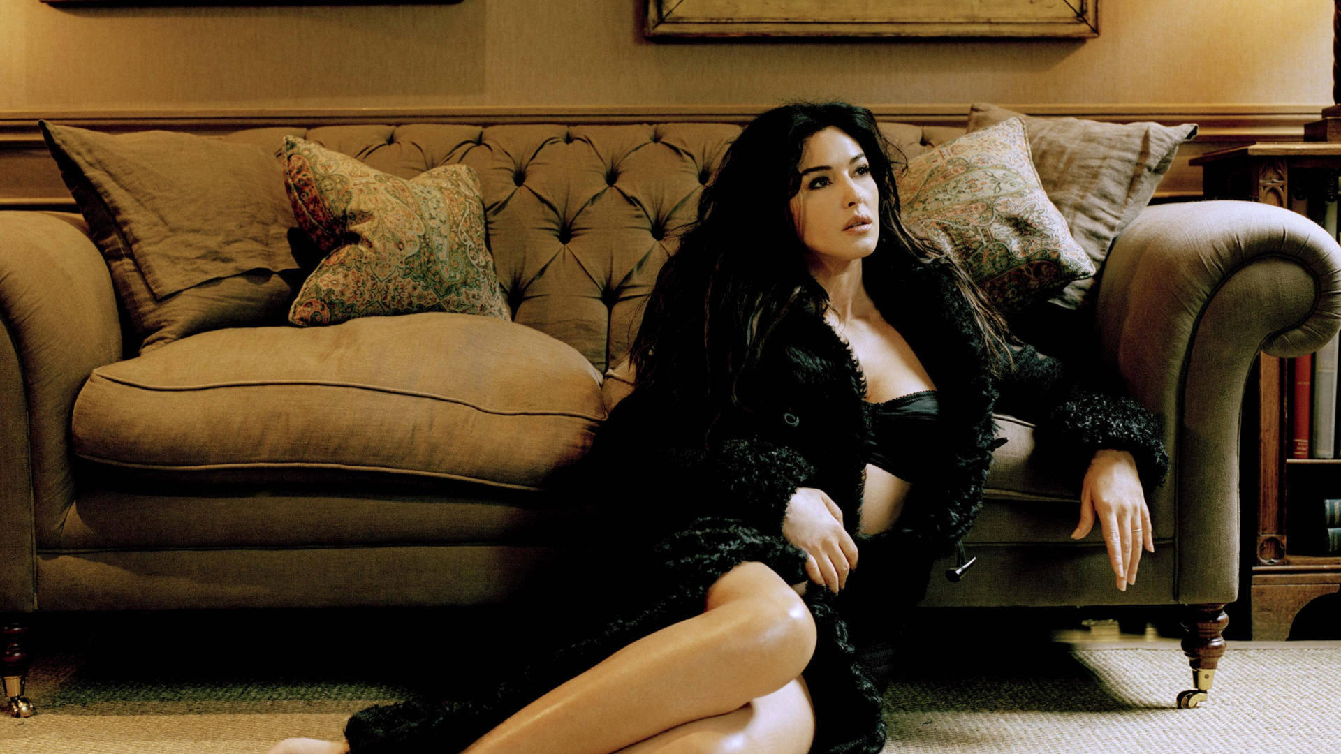 monica bellucci, italian, actress, model, brunette, sexy babe, sitting, posing, lingerie, fur, legs, feet, erotic, personality, monica, real celebs wall