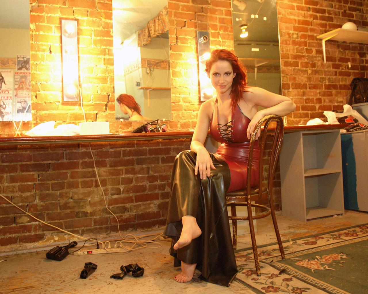 bianca beauchamp, canadian, model, redhead, sexy babe, fetishqueen, sitting, chair, smile, wardrobe, mirror, latex gown, after show