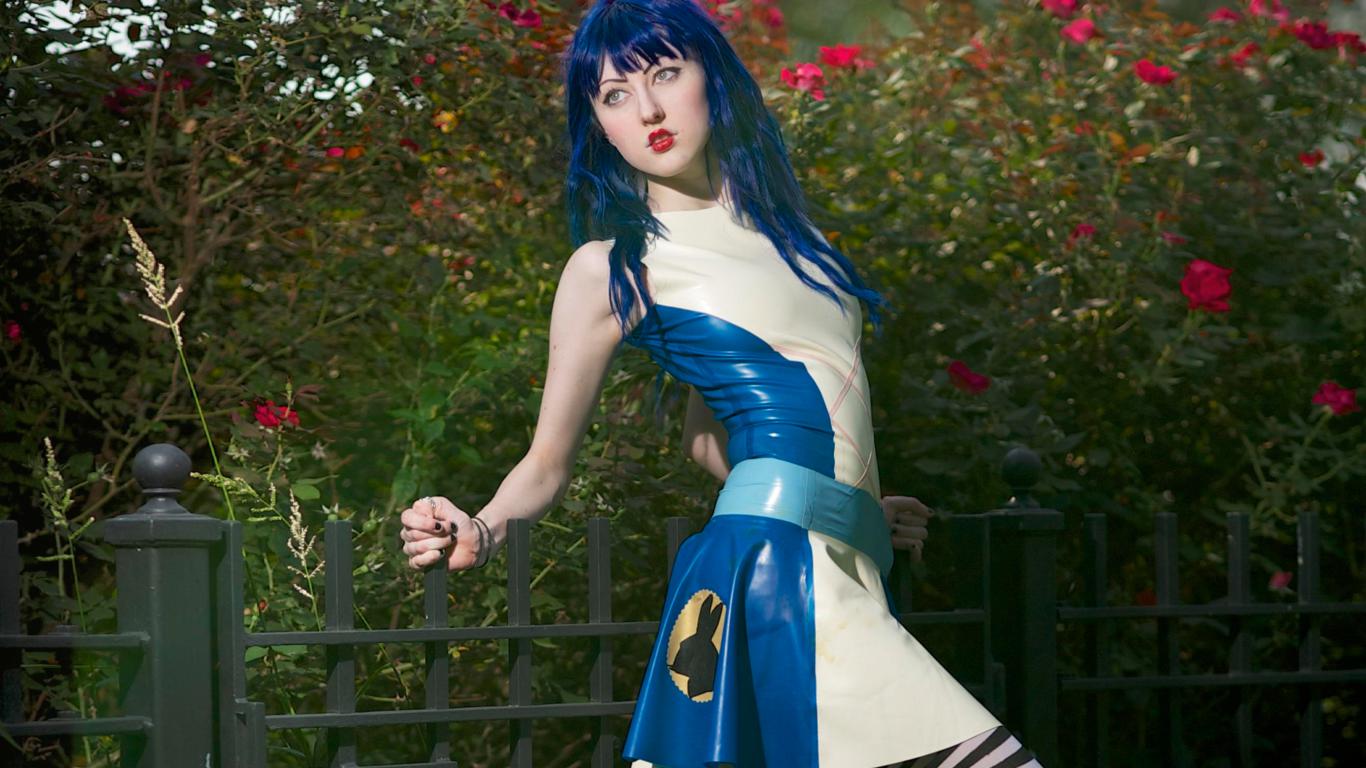 shiloh suicide, sexy babe, goth, young, dress, latex, rubber, fetish, shiny, blue hair, outdoor, garden, erotic, flowers, roses, kev kool foto, red lips, bunny, blue, white, pale skin, belt, fetish babe