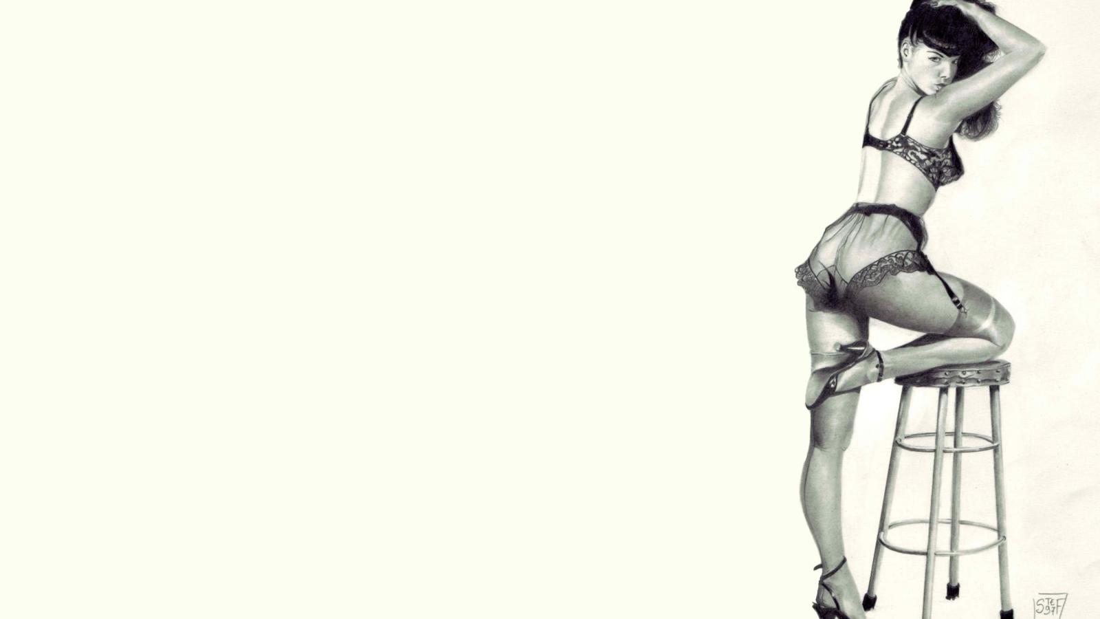 bettie page, betty, bettie, betty page, sexy babe, erotic, retro, bikini, heels, artwork, drawn, black hair, smile, lingerie, stockings, high heels, ass, vintage