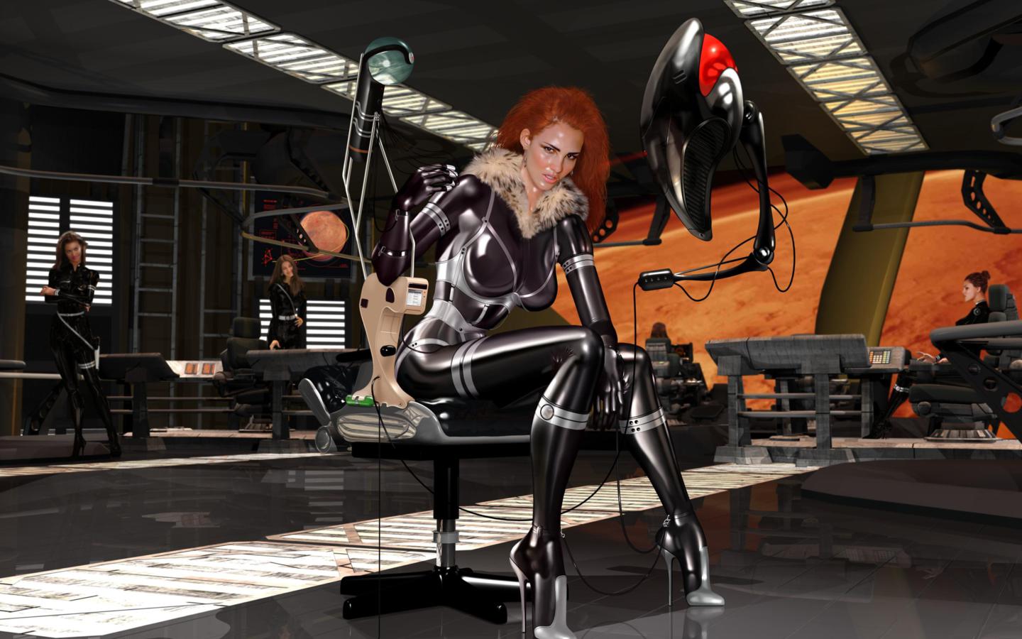 3d, art, fake, virtual babe, sexy babe, artwork, sitting, chair, latex, lingerie, fetish, shiny clothes, heels, redhead, rubber in space, mars needs women, fetish babe, 3d latex