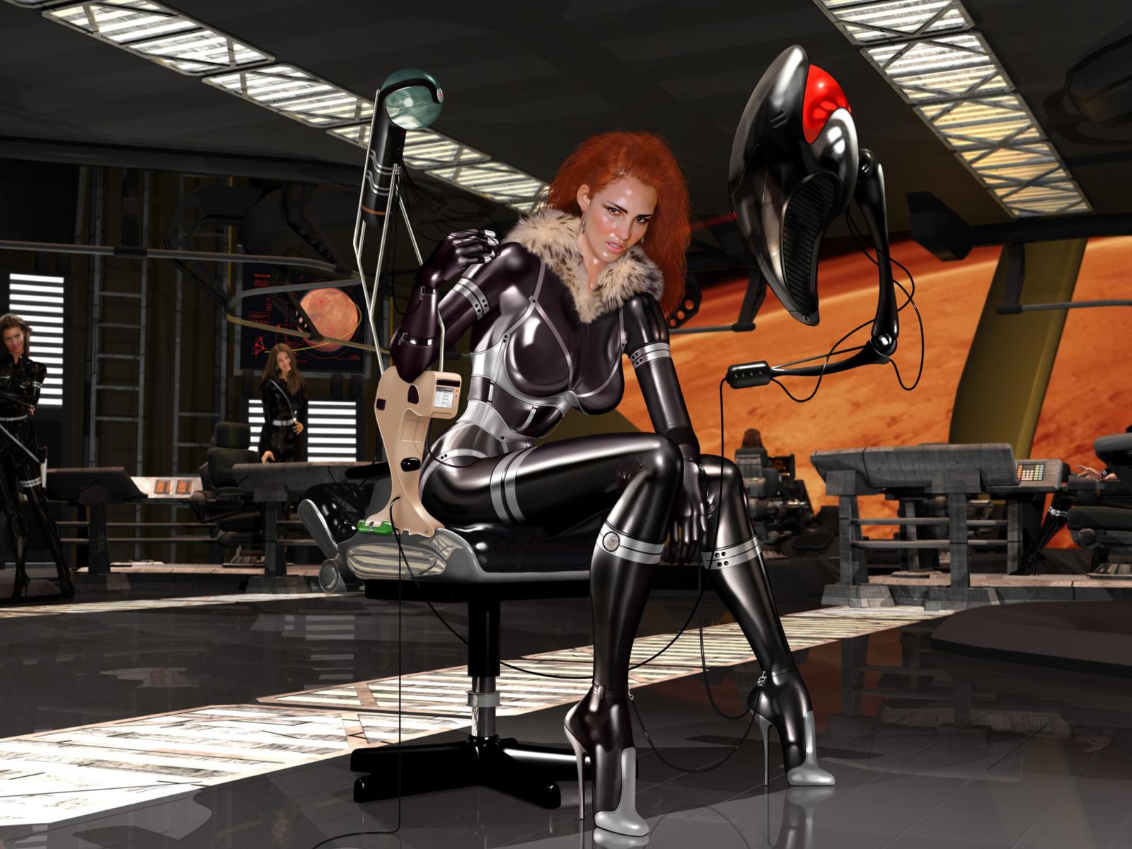 3d, art, fake, virtual babe, sexy babe, artwork, sitting, chair, latex, lingerie, fetish, shiny clothes, heels, redhead, rubber in space, mars needs women, fetish babe, 3d latex