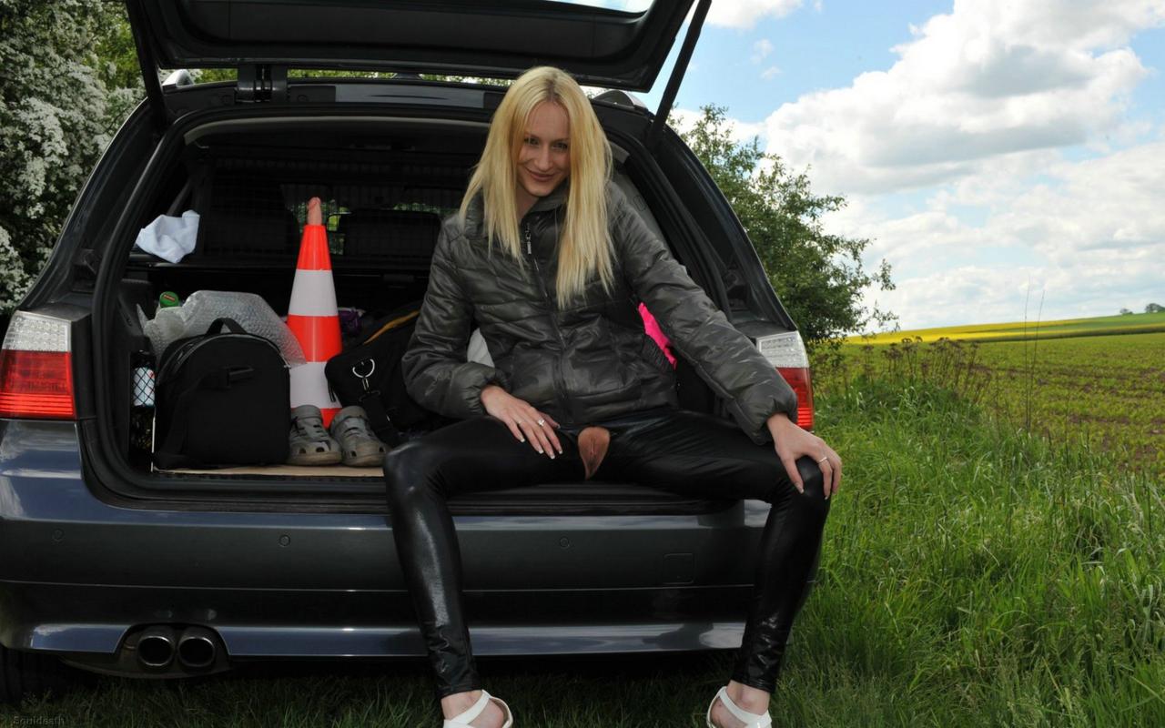 amalka ross, outdoor, blond, longhair, collection, young, sexy babe, posing, outdoor, shiny clothes, lycra, leggings, open crotch, flashing, tasty, shaved, cunt, spread, legs