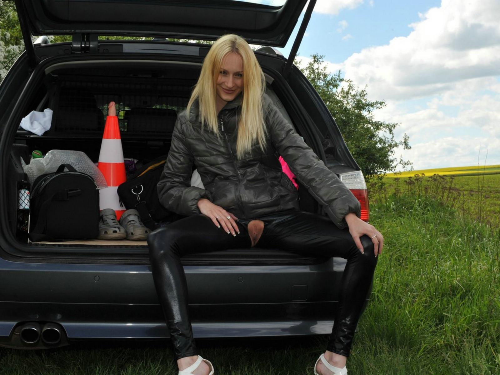 amalka ross, outdoor, blond, longhair, collection, young, sexy babe, posing, outdoor, shiny clothes, lycra, leggings, open crotch, flashing, tasty, shaved, cunt, spread, legs