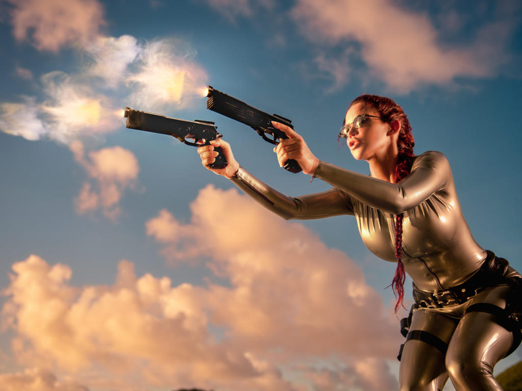 bianca beauchamp, canadian, model, redhead, sexy babe, fetishqueen, cosplay, lara croft, tomb raider, close up, tight clothes, rubber, fetish, catsuit, firing, pistols, girls and guns, tomb raider set, fantasy, bianca, guns, successfull re-up, fetish babe