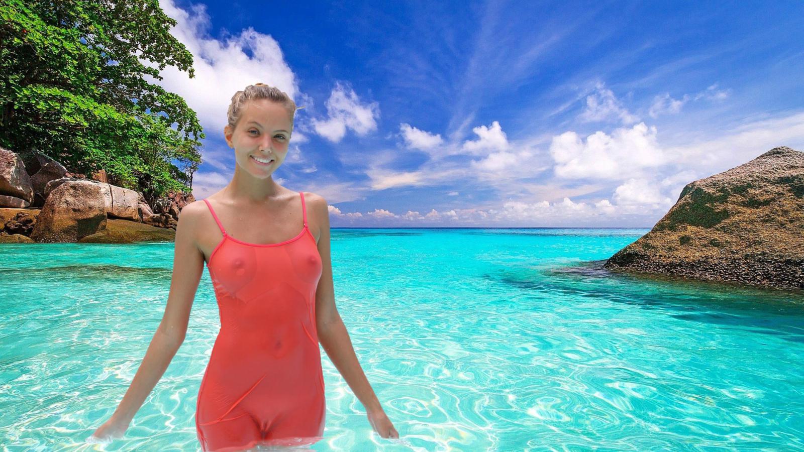 katya clover, clover, mango, see through swimsuit, beach, shaved pussy, nipples, smile, mango a, caramel, see through, cameltoe, sheer