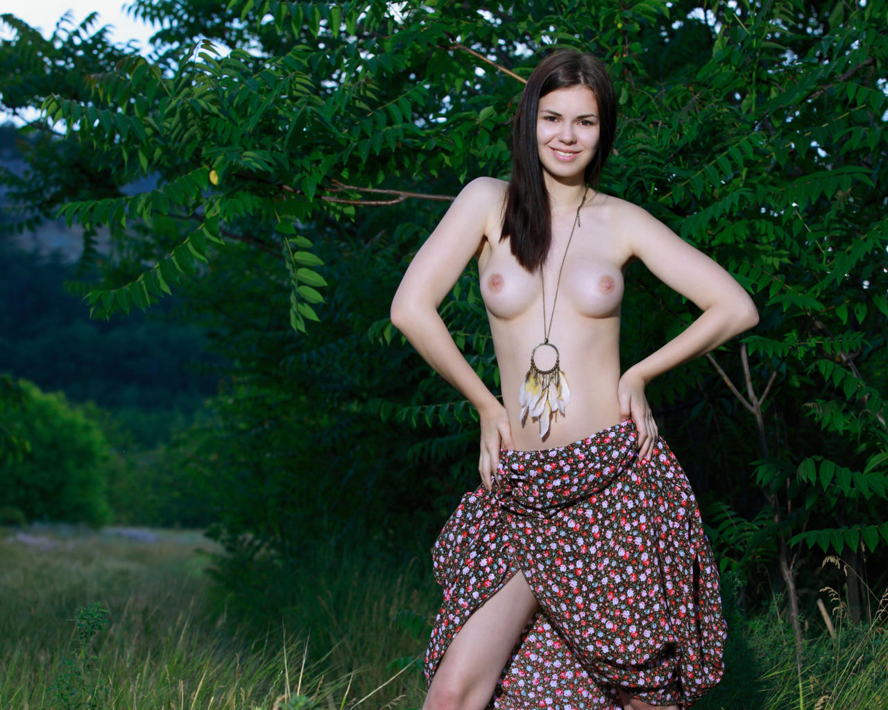 karolina young, brunette, breasts, boobs, boobies, titties, nipples, rack, topless, skirt, cute, beautiful, metart, model, posing, outdoors, nature, hi-q, smile, necklace, feathers