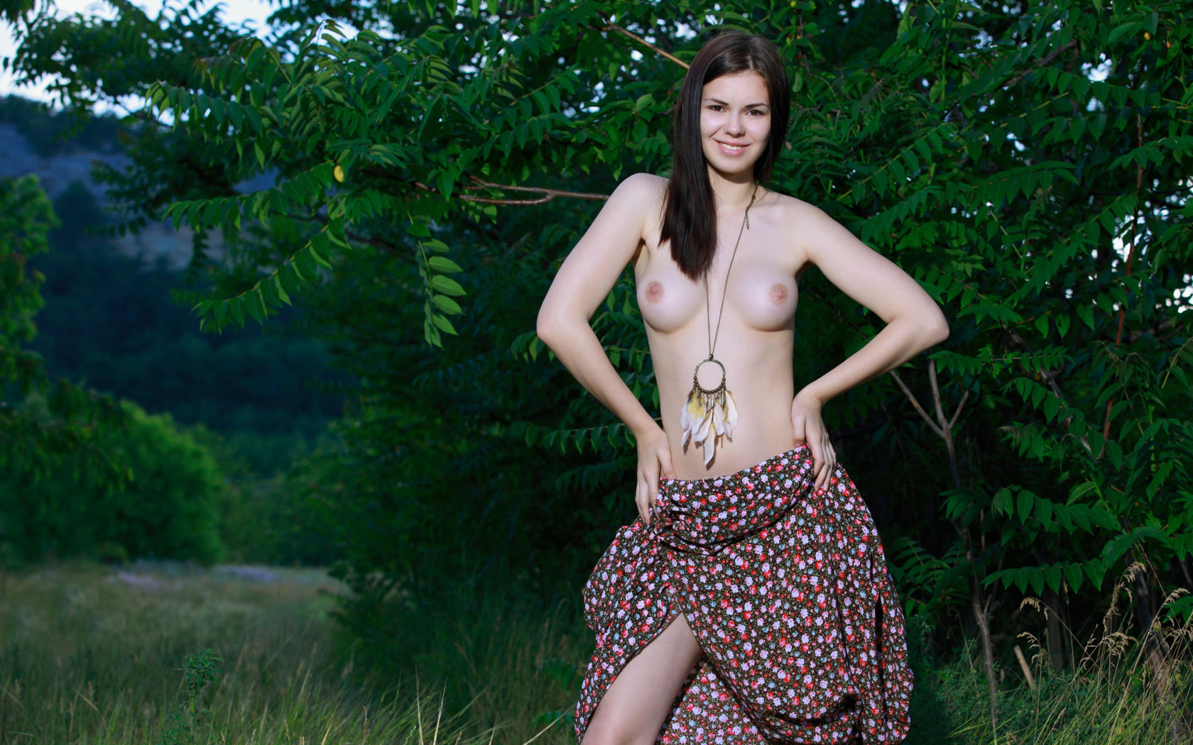 karolina young, brunette, breasts, boobs, boobies, titties, nipples, rack, topless, skirt, cute, beautiful, metart, model, posing, outdoors, nature, hi-q, smile, necklace, feathers