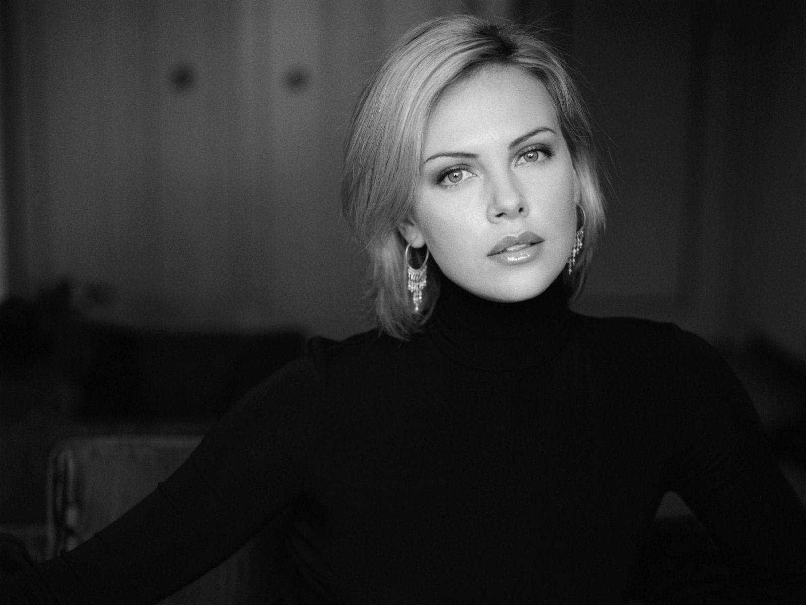 сharlize theron, blonde, actress, black and white, sexy, long hair