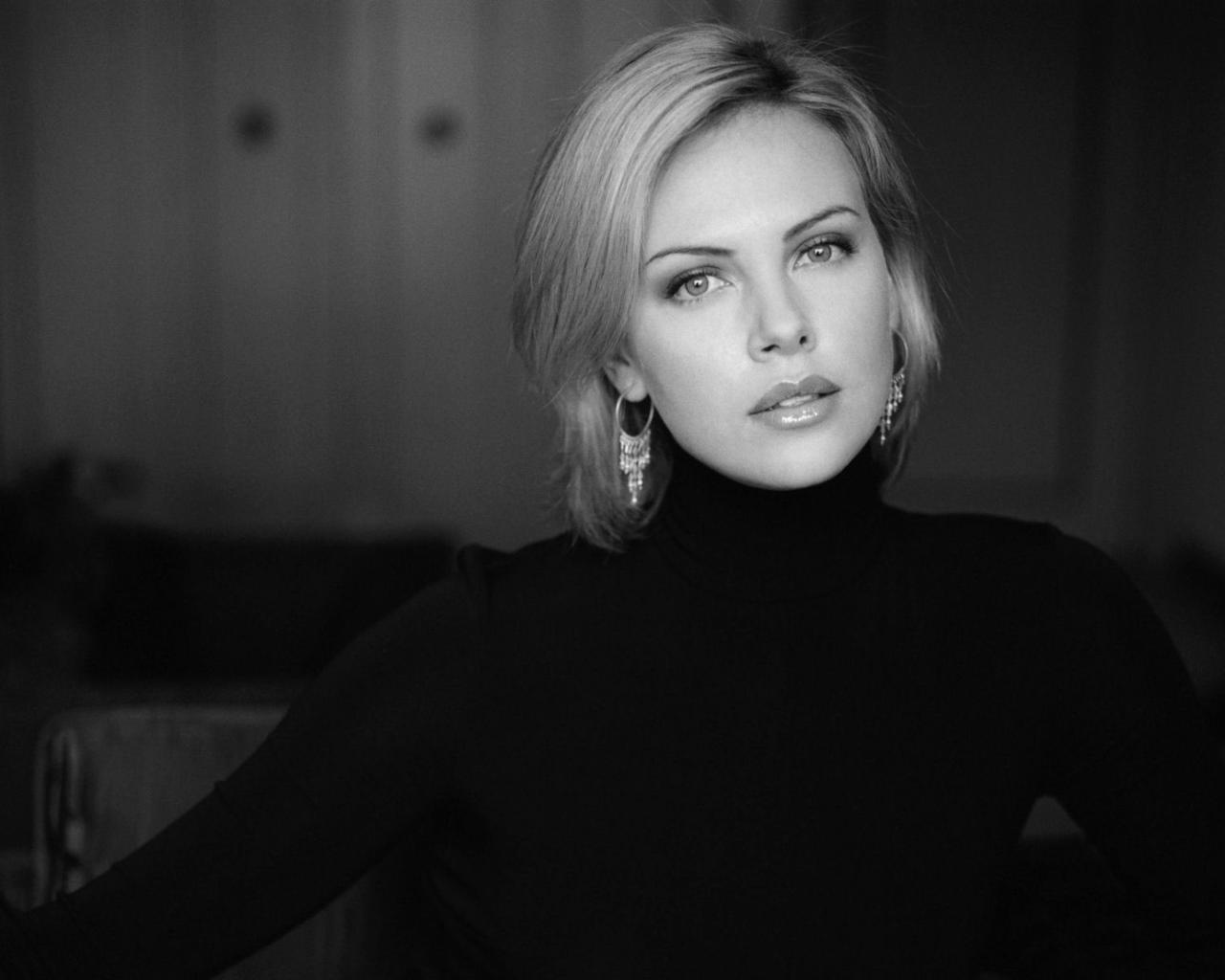 сharlize theron, blonde, actress, black and white, sexy, long hair