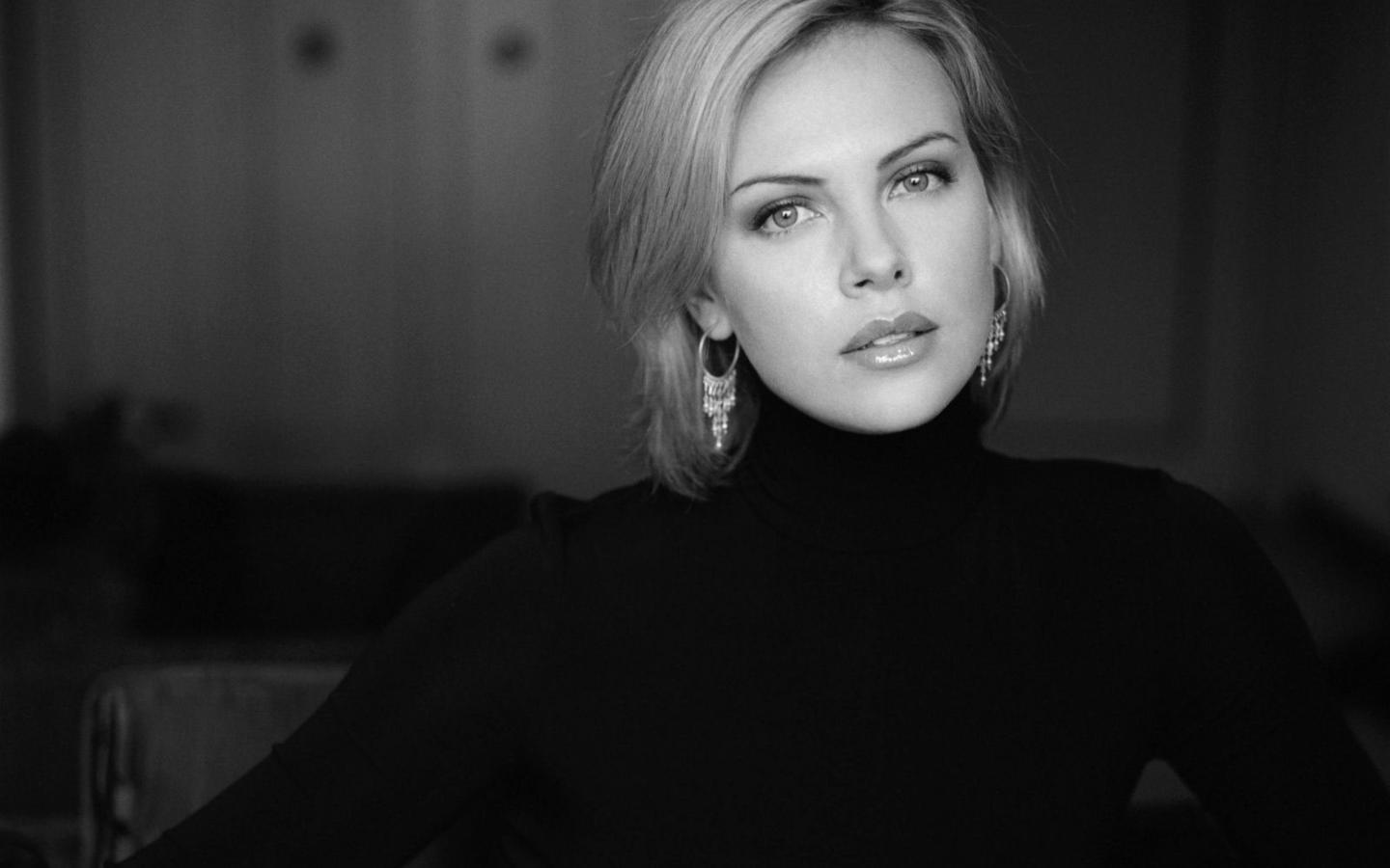 сharlize theron, blonde, actress, black and white, sexy, long hair