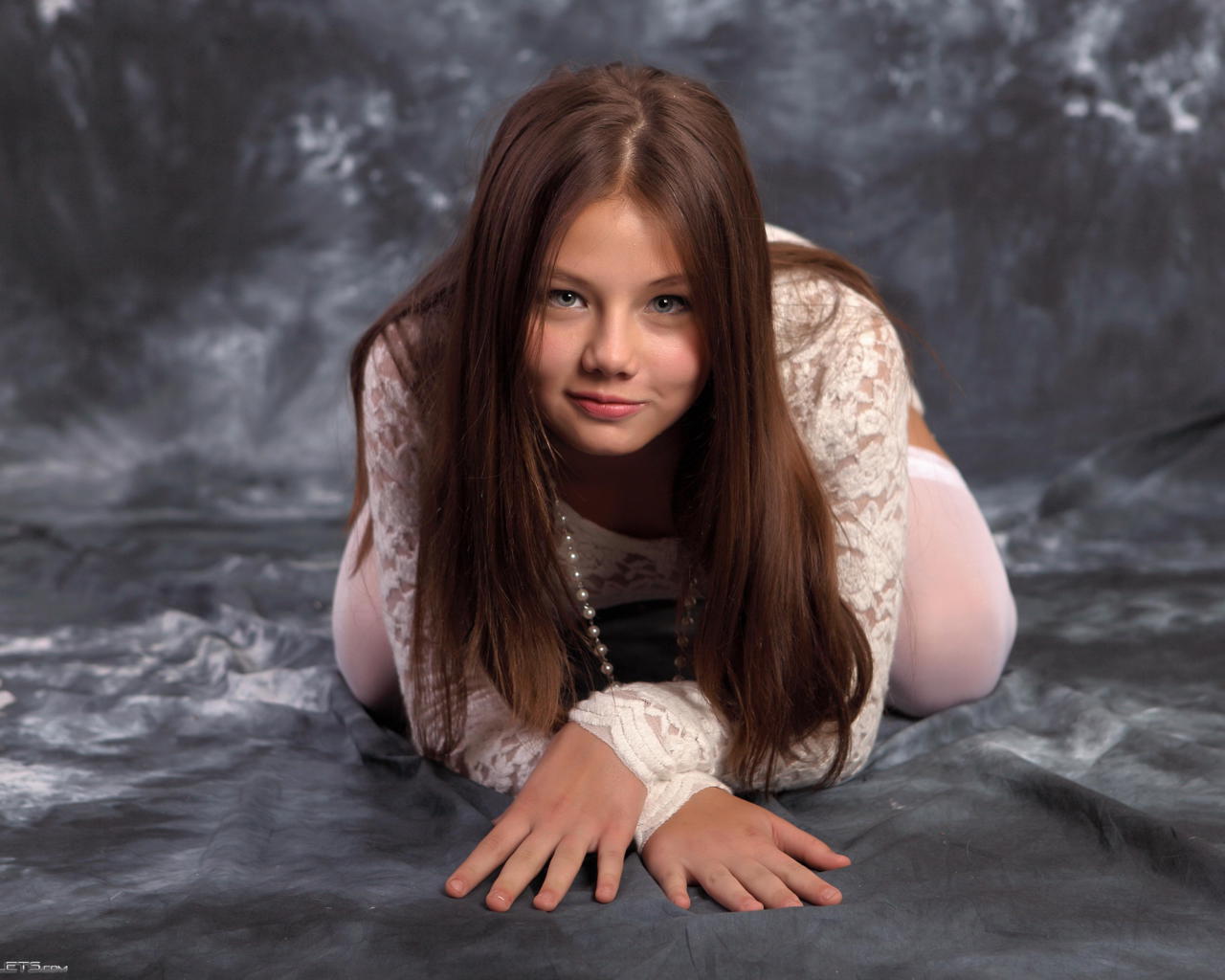 kleofia, brunette, sexy girl, young model, beads, kneeling, long hair, view, look