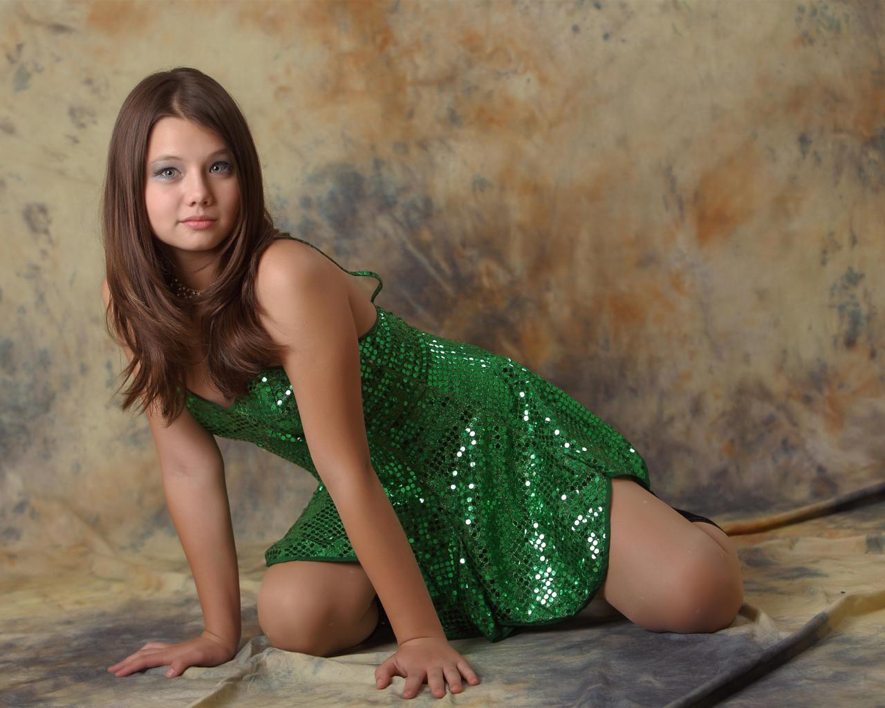 kleofia, brunette, sexy girl, young model, sweet, cute, green dress, knees, long hair, view, look