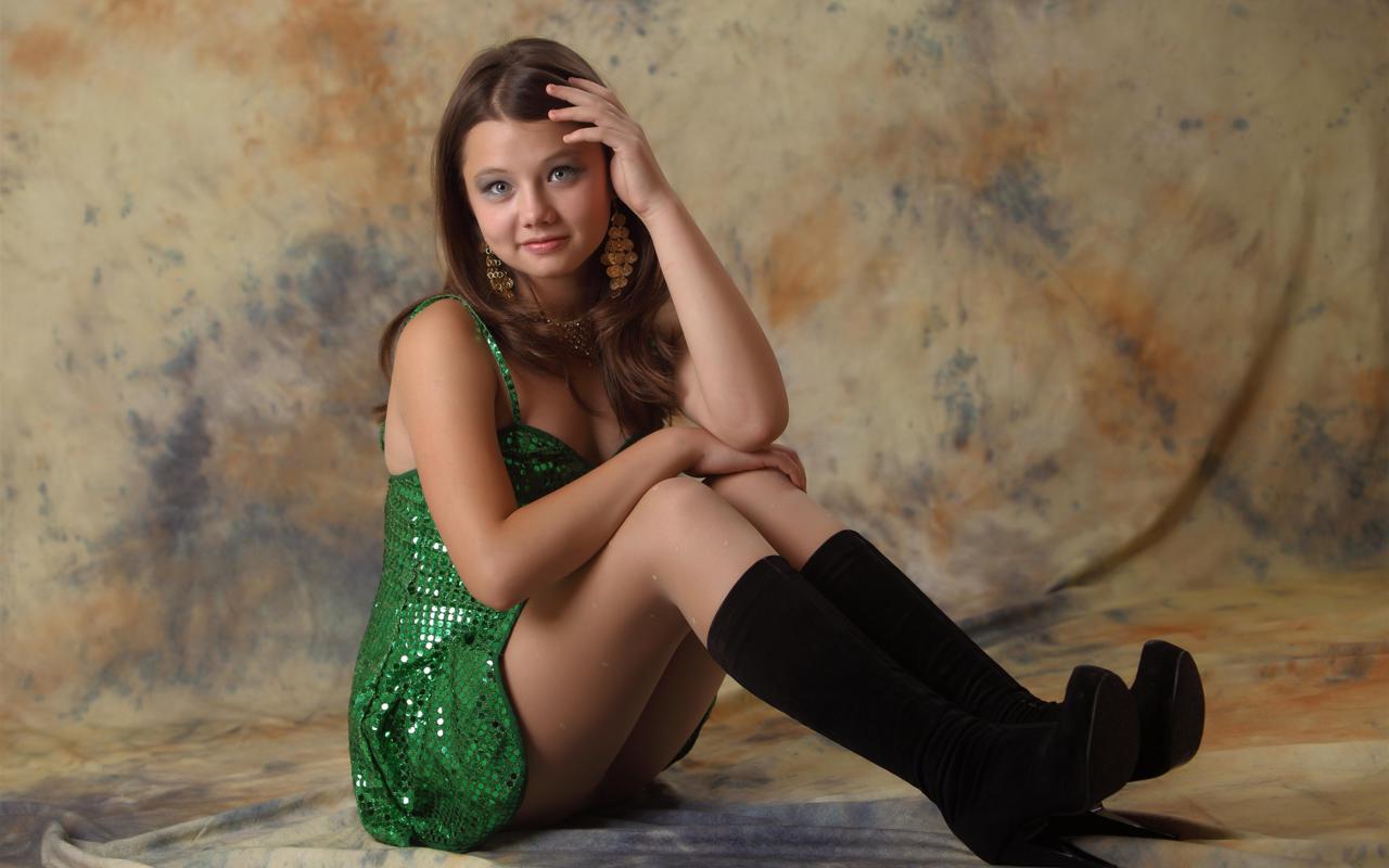 kleofia, brunette, sexy girl, young model, sweet, cute, green dress, boots, pantyhose, knees, earrings, smile, long hair, view, look