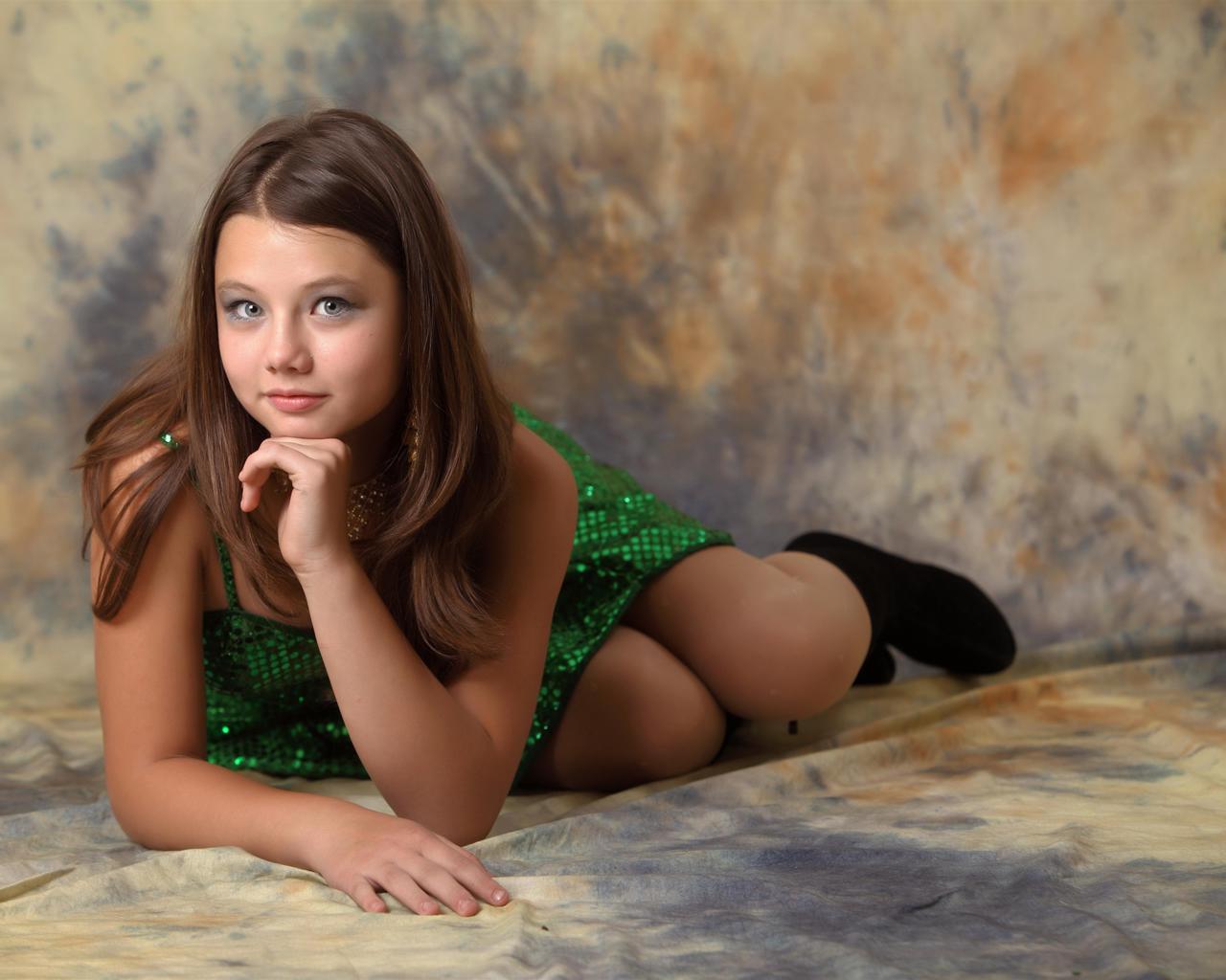 kleofia, brunette, sexy girl, young model, sweet, cute, green dress, knees, lovely face, long hair, view, look