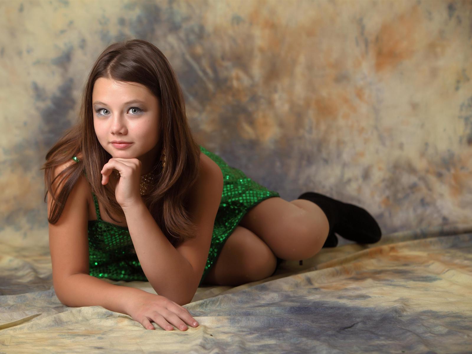 kleofia, brunette, sexy girl, young model, sweet, cute, green dress, knees, lovely face, long hair, view, look