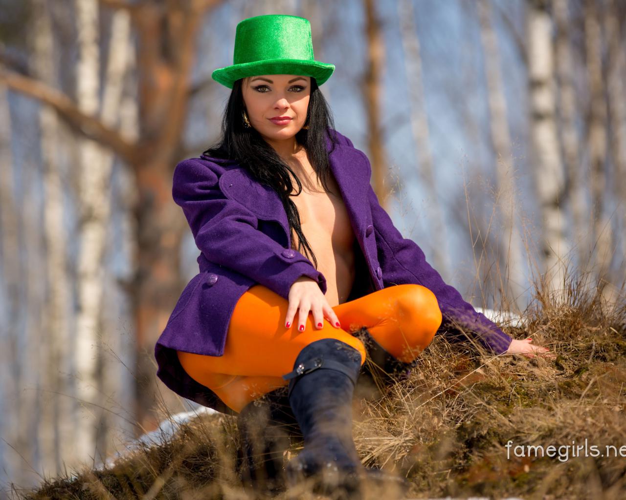 katie, brunette, sexy girl, adult model, :), beautiful, leggings, boots, coat, hat, orange, long hair, view, look