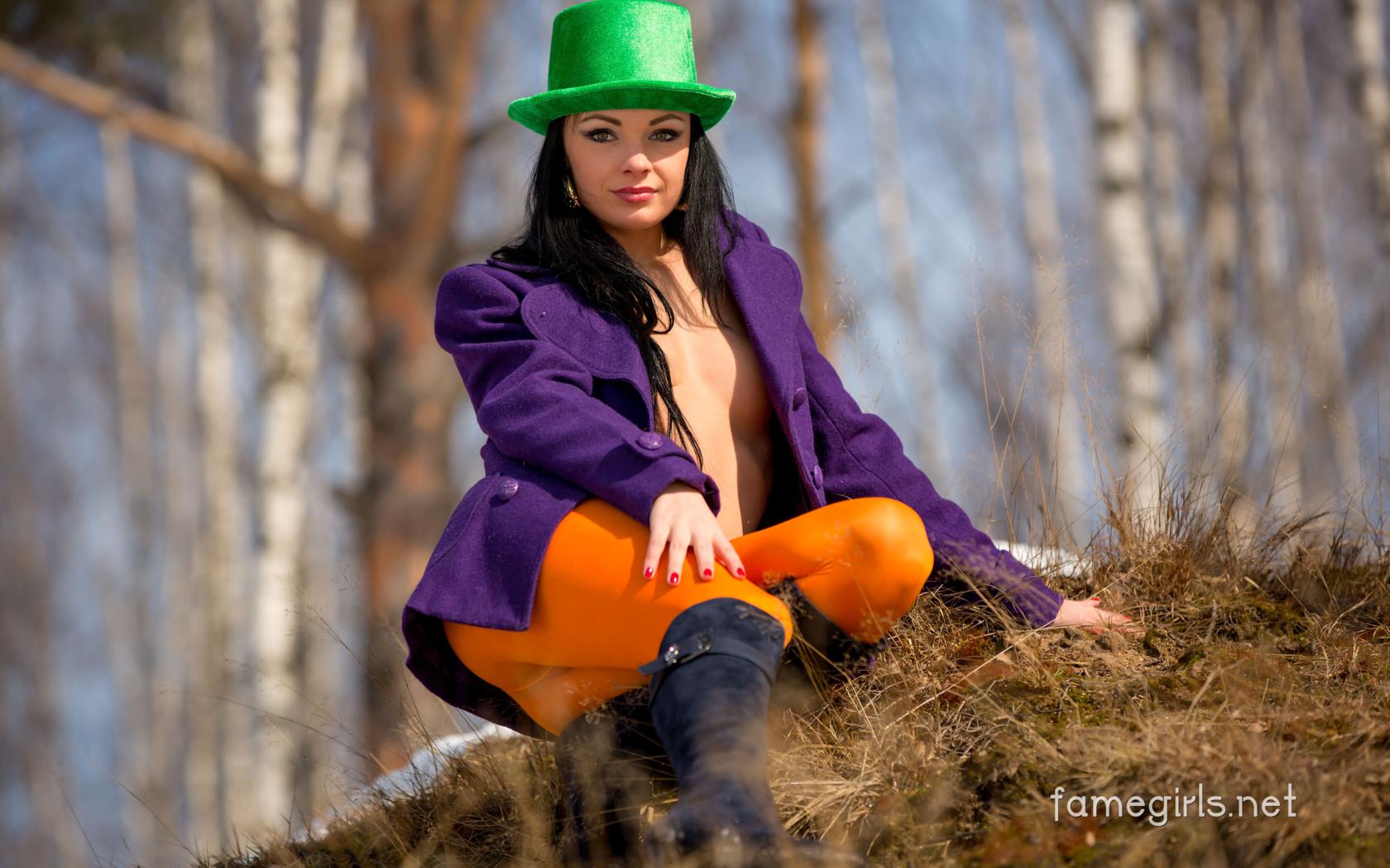 katie, brunette, sexy girl, adult model, :), beautiful, leggings, boots, coat, hat, orange, long hair, view, look