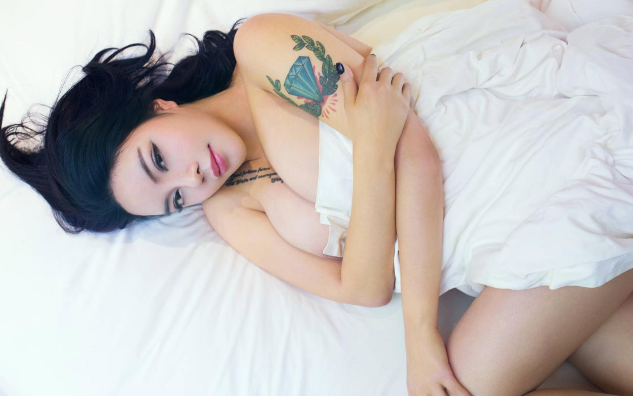 feng yu zhi, exotic, brunette, curvy, actress, model, busty, chinese, sexy babe, long hair, posing, laying, bed, smile, close up, covered, natural big tits, tattoo, erotic