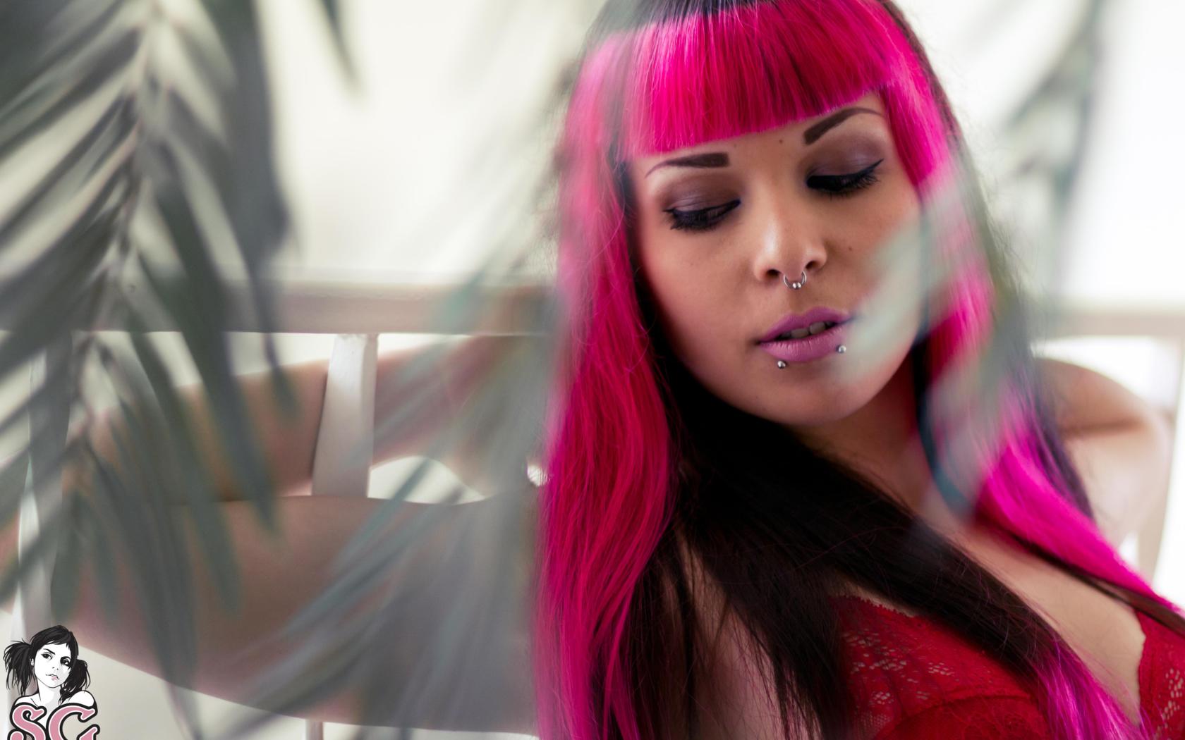 breasts, cute, luna, model, perfect girl, petite, piercing, pink hair, red lingerie, suicide girls, tattoo