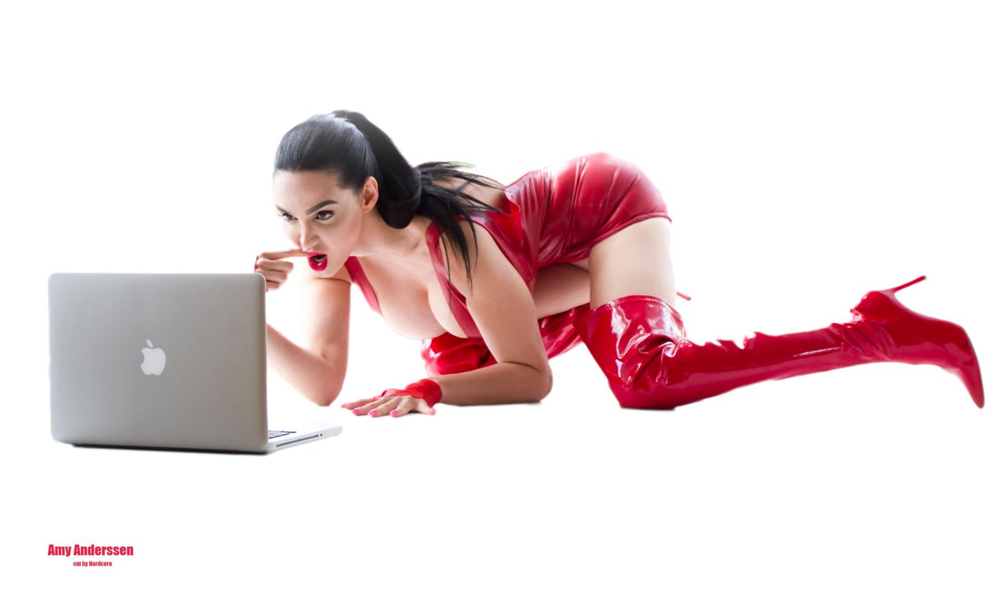 amy anderssen, brunette, adult model, exotic, pornstar, busty, sexy babe, long hair, latina, pornactress, posing, kneeling, tight clothes, latex, minidress, decollete, pvc, overknee boots, fetish babe, erotic, minimalist wall, shiny, rubber, fetish, laptop