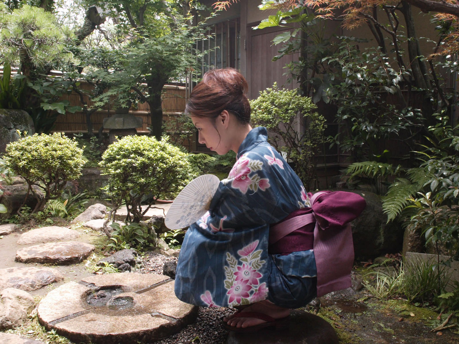 kyoko kazama, kinbaku model, japanese garden, kimono, bondage, asian, round fan, submissive girl, fetish babe, hot, fan