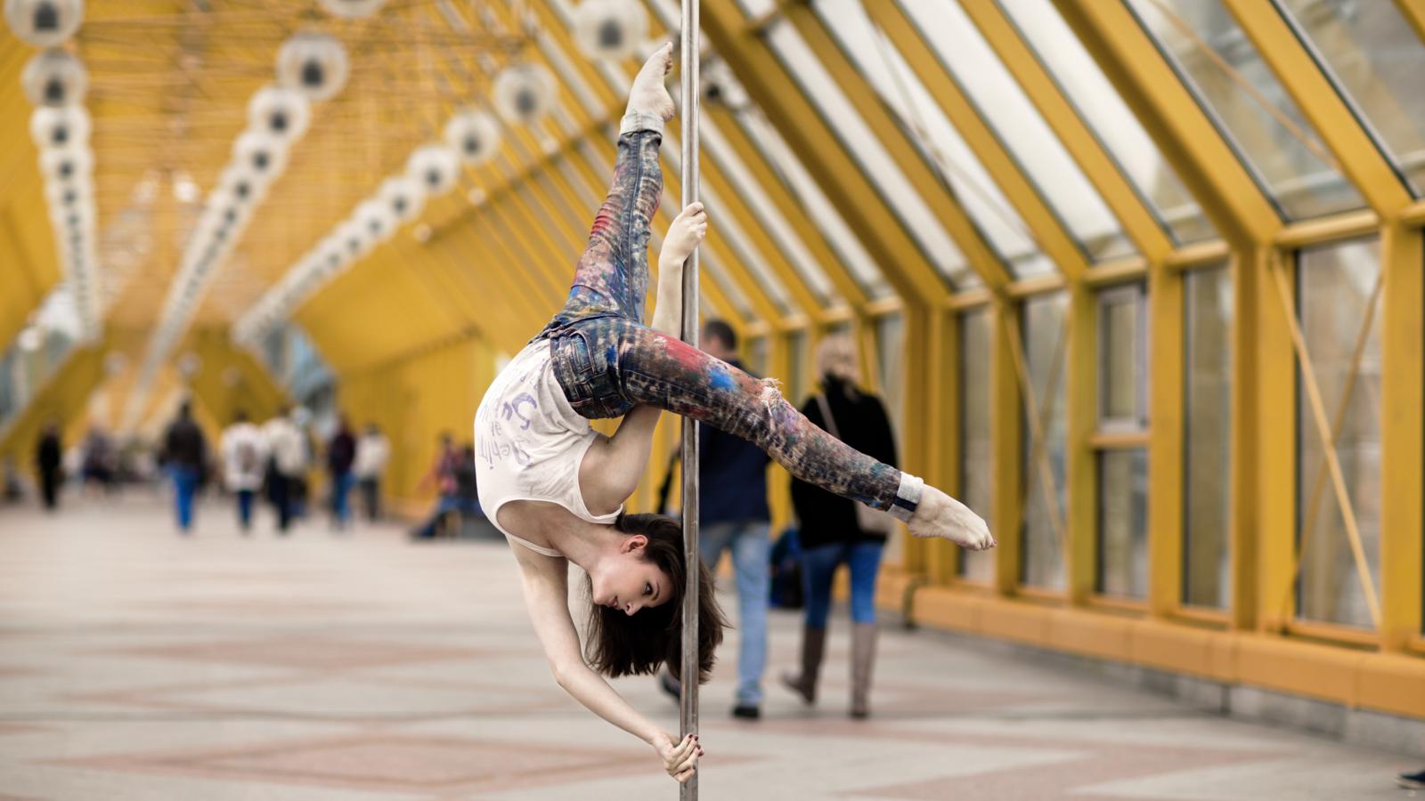 ← Go back: black haired, public, pole,...