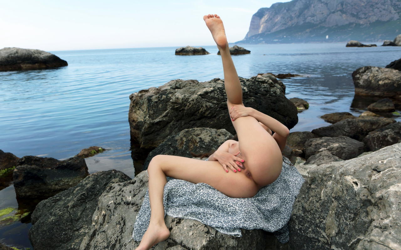 li moon, kiki, lee moon, annika a, brunette, beach, rocks, naked, shaved pussy, spread labia, ass, spread legs, hi-q, sea