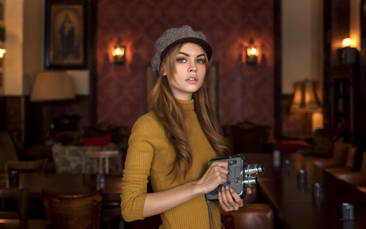 anastasia scheglova, model, pretty, russian, hat, old camera, sweater, sensual lips, face, camera, 4k, uhd