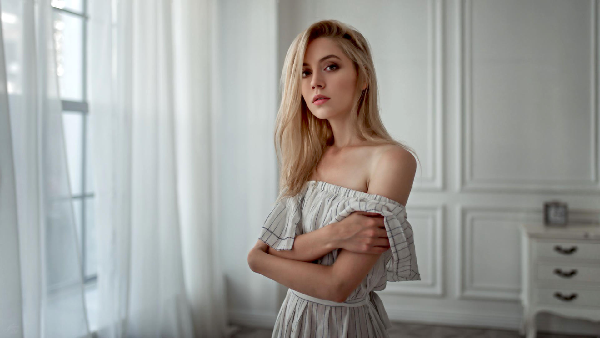 ksenia kokoreva, model, pretty, babe, blonde, russian, white dress, 4k, uhd