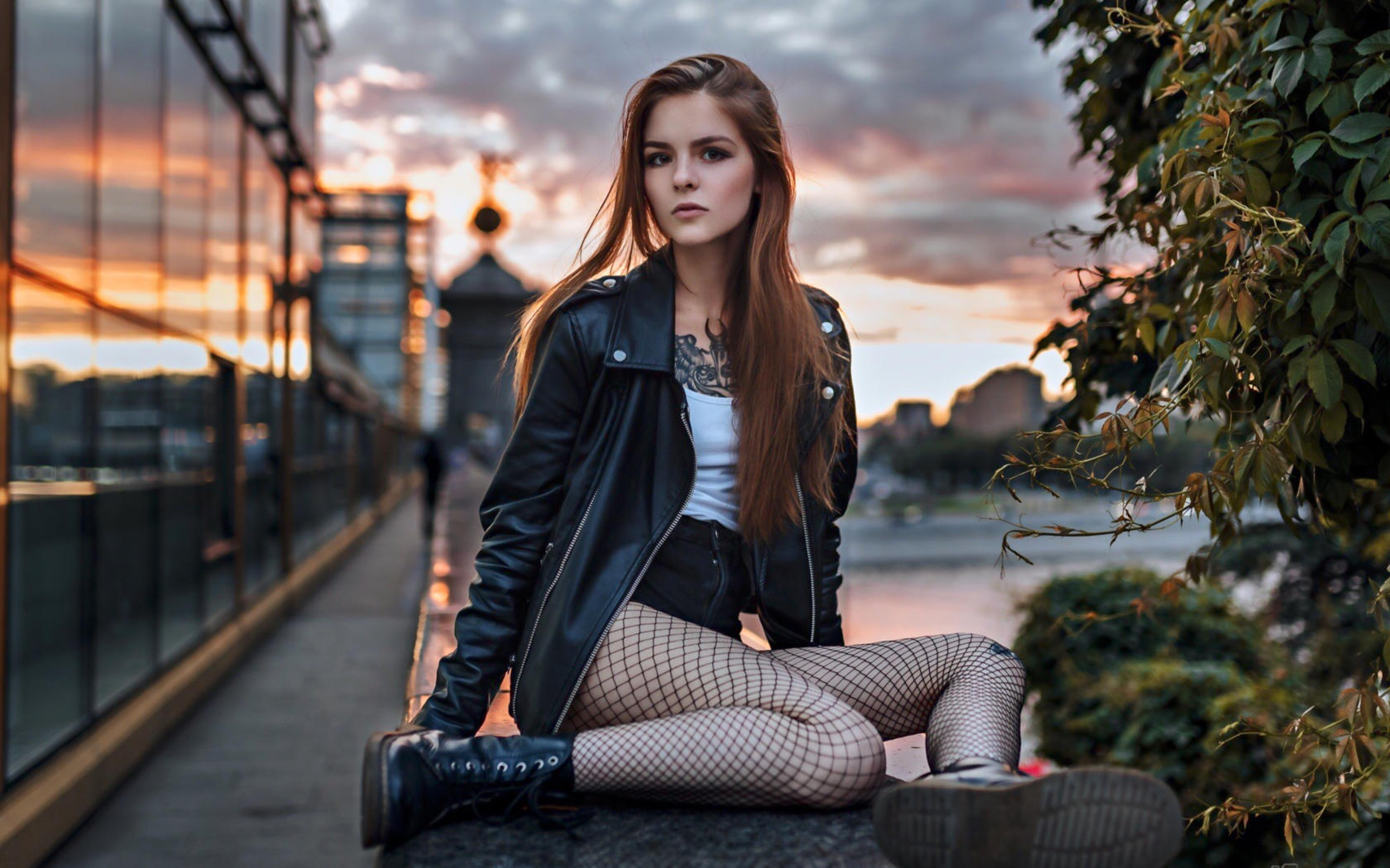 vasilisa sarovskaya, model, pretty, babe, brunette, russian, leather jacket, tattoo, shorts, fishnet, boots, moscow, 4k, uhd