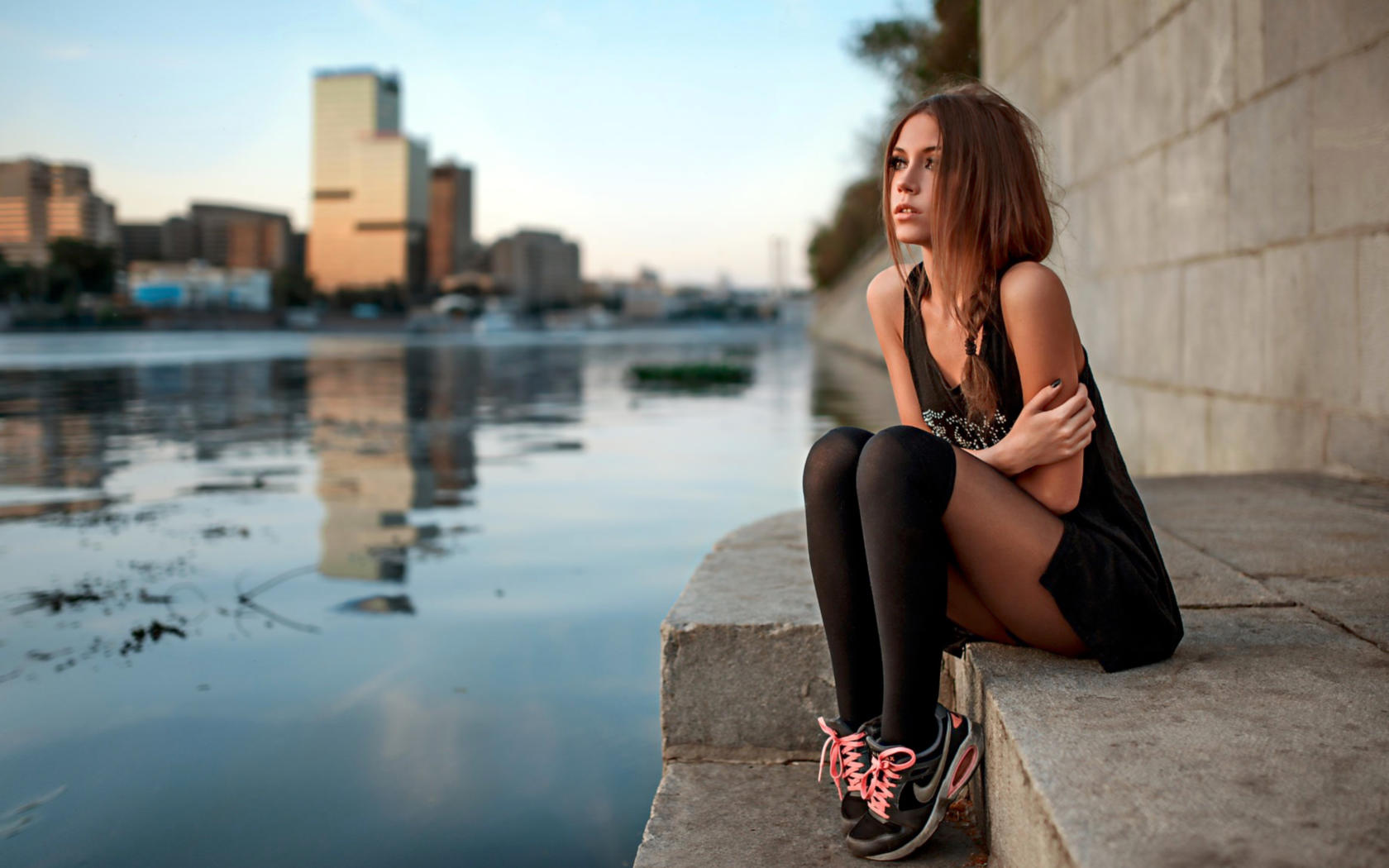 ksenia kokoreva, model, pretty, babe, brunette, nylons, knee socks, sneakers, depth of field, moscow, 4k, river, georgy chernyadyev studio, nikes