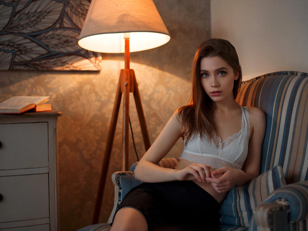 ksenia kokoreva, model, pretty, babe, brunette, russian, white bra, bra, skirt, sofa, 4k