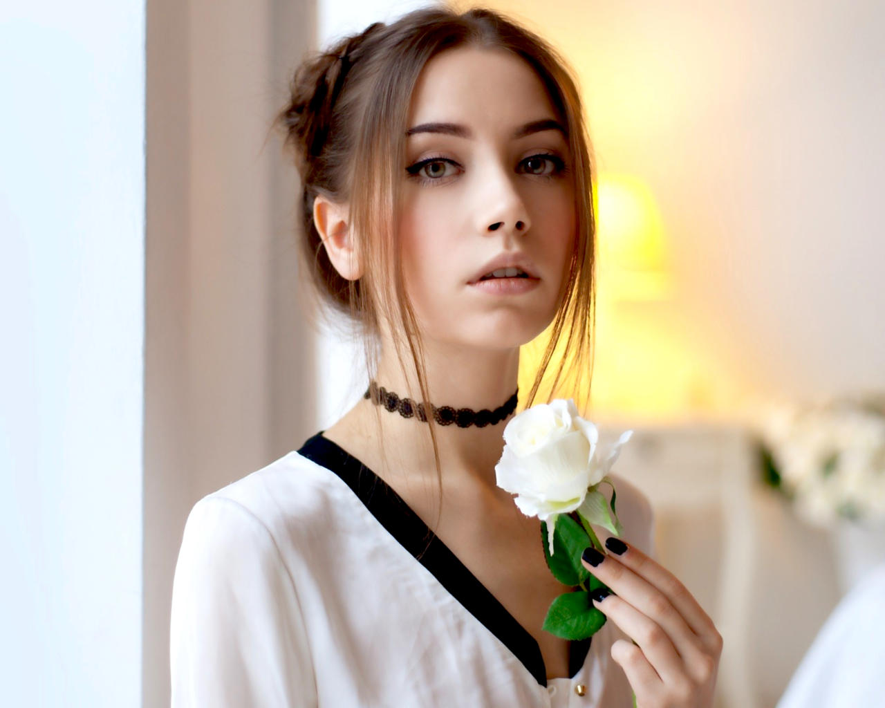 ksenia kokoreva, model, pretty, babe, brunette, russian, sensual lips, face, rose, 4k, white rose