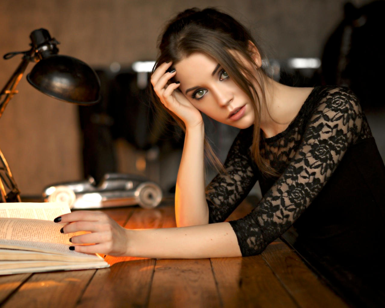 ksenia kokoreva, model, pretty, babe, brunette, russian, sensual lips, eyes, book, 4k, face, lamp, homework, eye contact, non nude