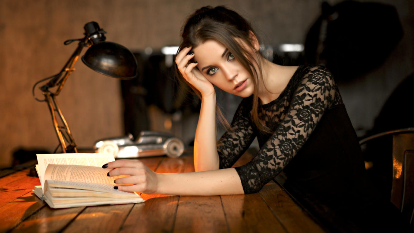 ksenia kokoreva, model, pretty, babe, brunette, russian, sensual lips, eyes, book, 4k, face, lamp, homework, eye contact, non nude