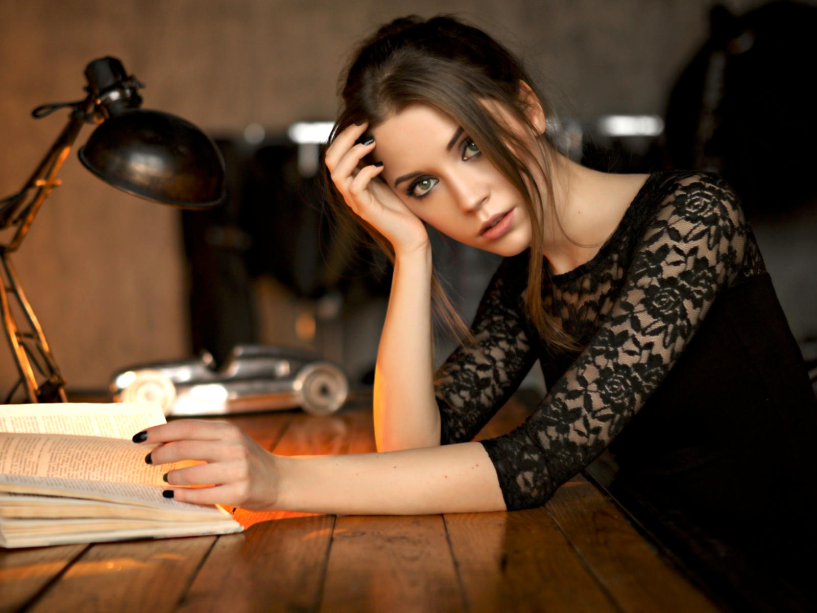 ksenia kokoreva, model, pretty, babe, brunette, russian, sensual lips, eyes, book, 4k, face, lamp, homework, eye contact, non nude
