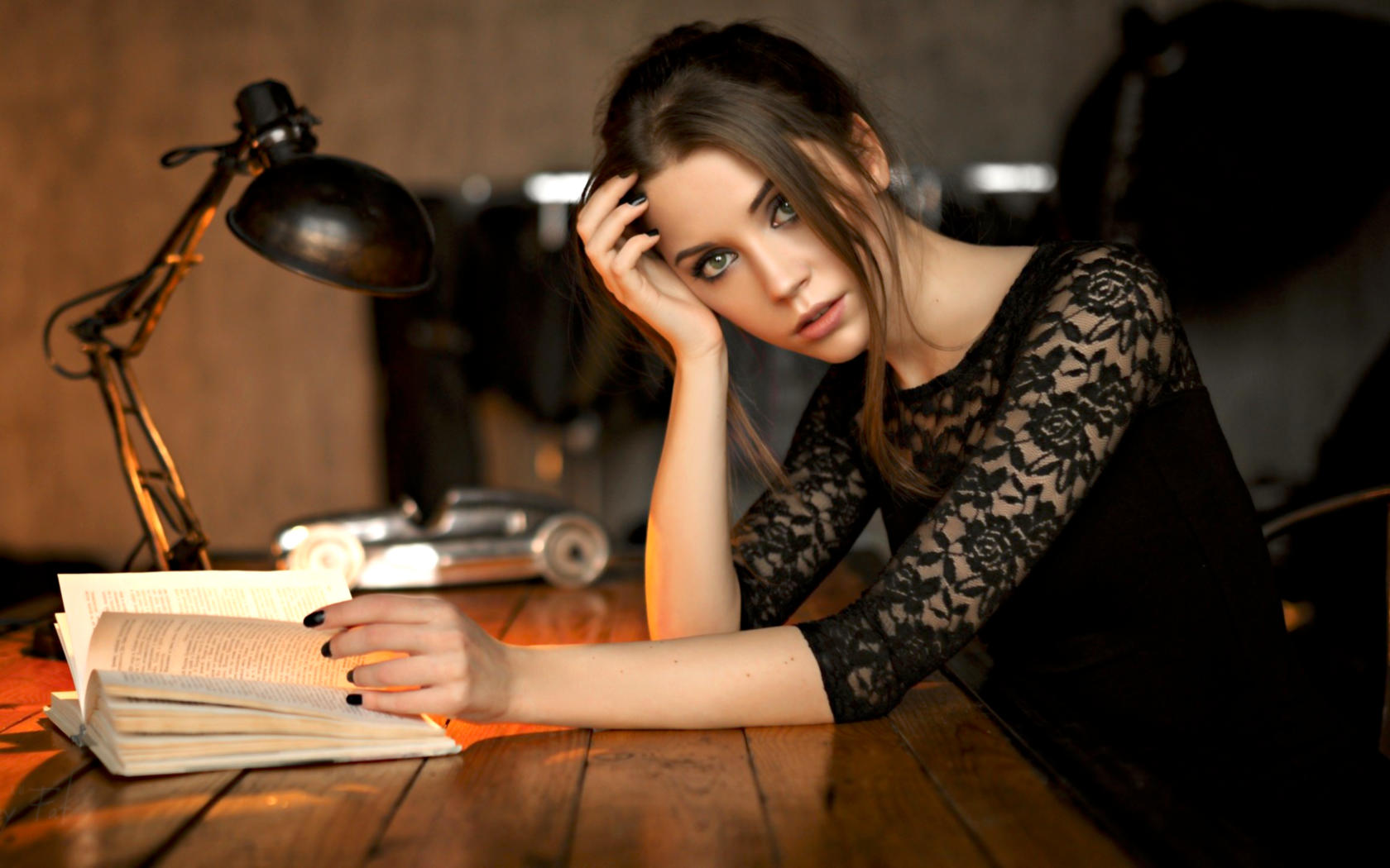 ksenia kokoreva, model, pretty, babe, brunette, russian, sensual lips, eyes, book, 4k, face, lamp, homework, eye contact, non nude