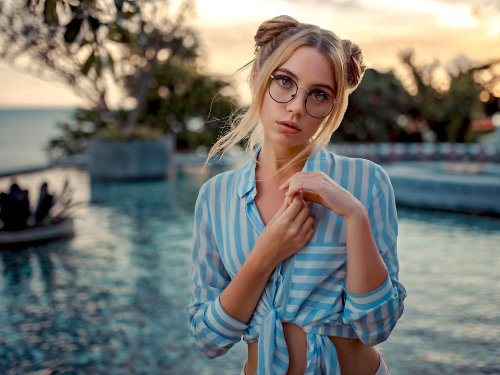 ksenia kokoreva, model, pretty, babe, blonde, russian, sensual lips, glasses, blouse, face, 4k, outdoors, depth of field
