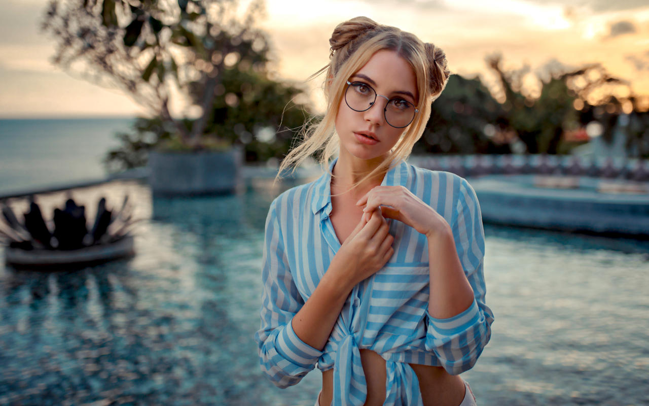 ksenia kokoreva, model, pretty, babe, blonde, russian, sensual lips, glasses, blouse, face, 4k, outdoors, depth of field