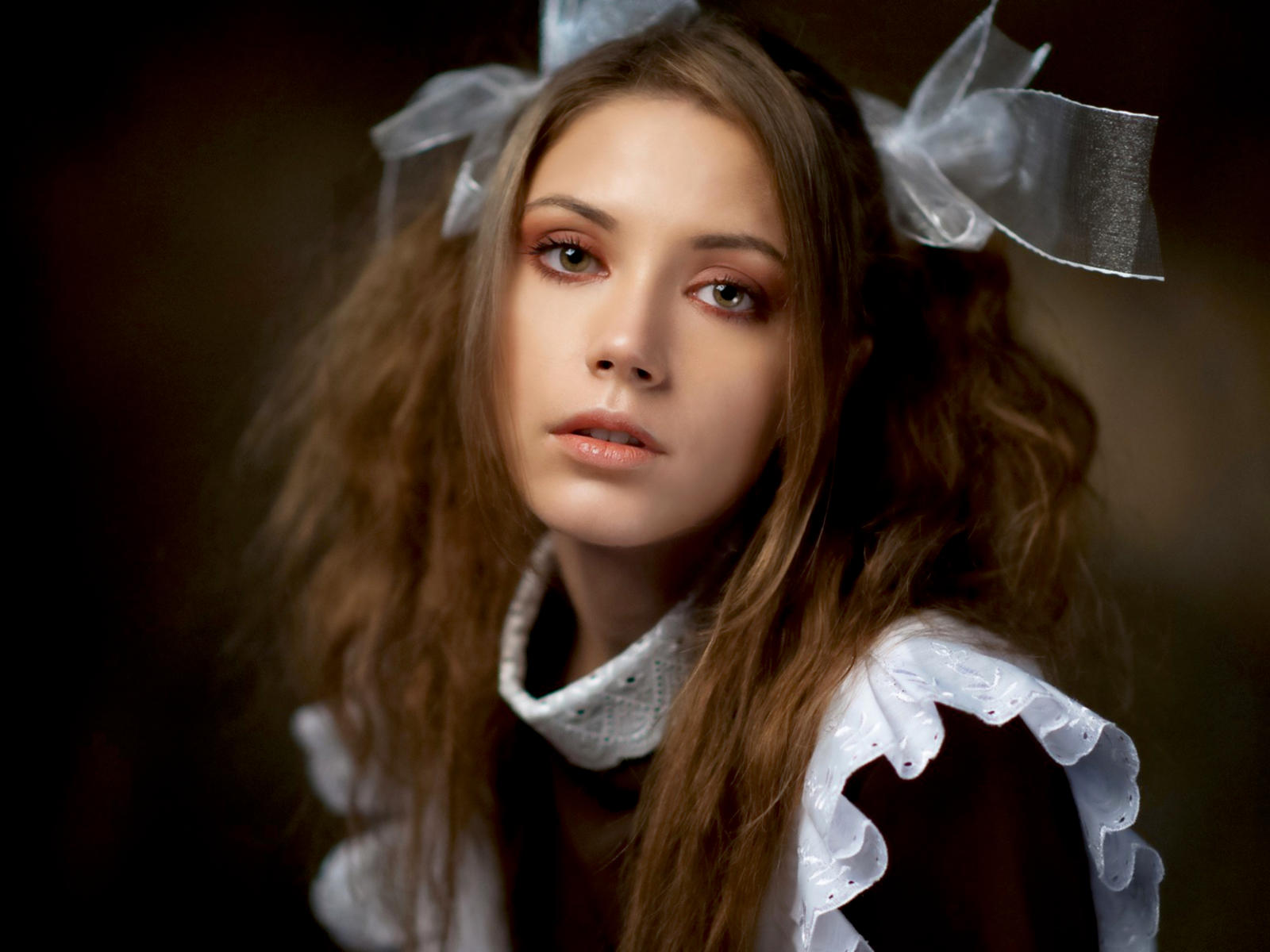 ksenia kokoreva, model, pretty, brunette, sensual lips, face, portrait, schoolgirls, ddlg, bow