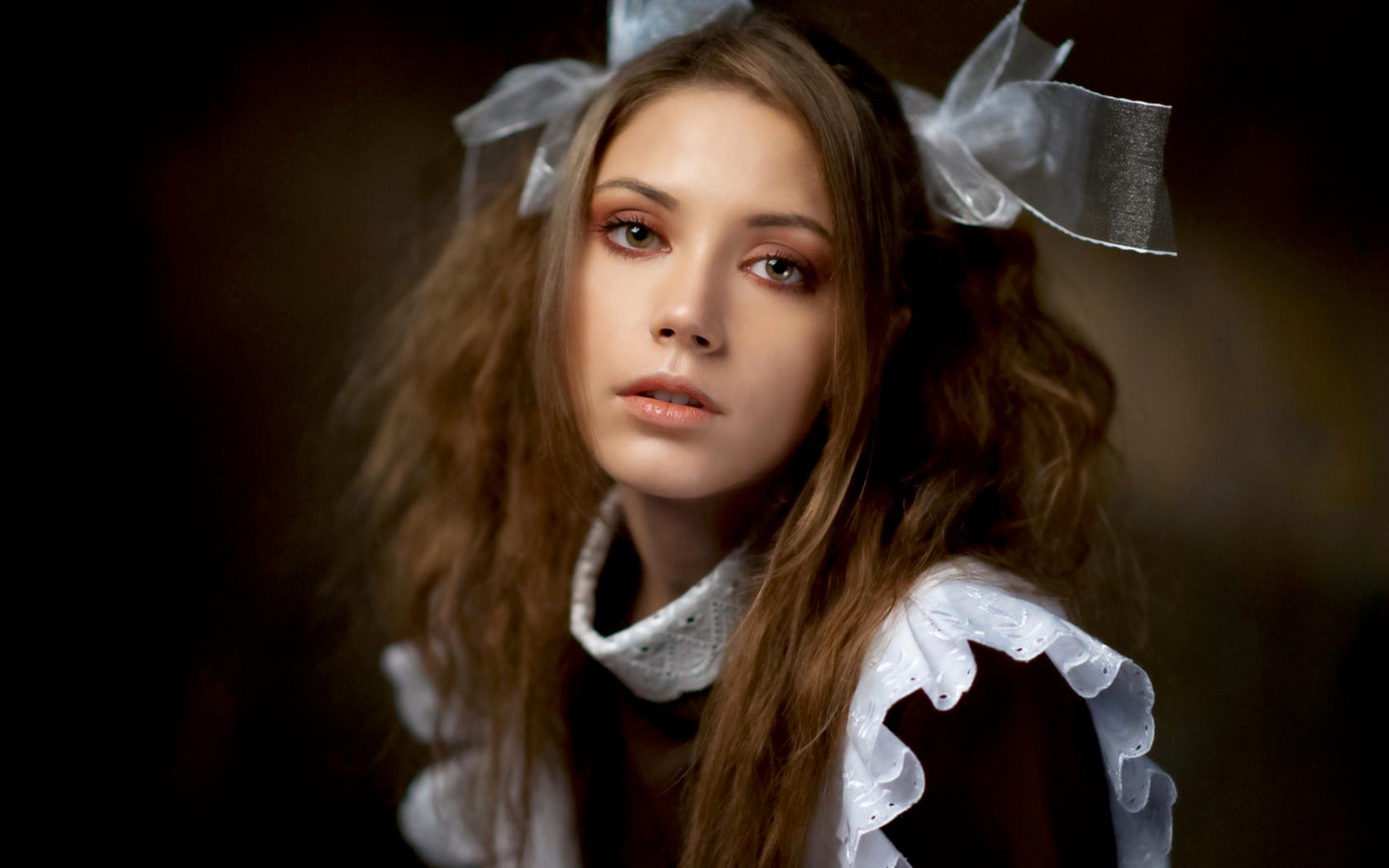 ksenia kokoreva, model, pretty, brunette, sensual lips, face, portrait, schoolgirls, ddlg, bow