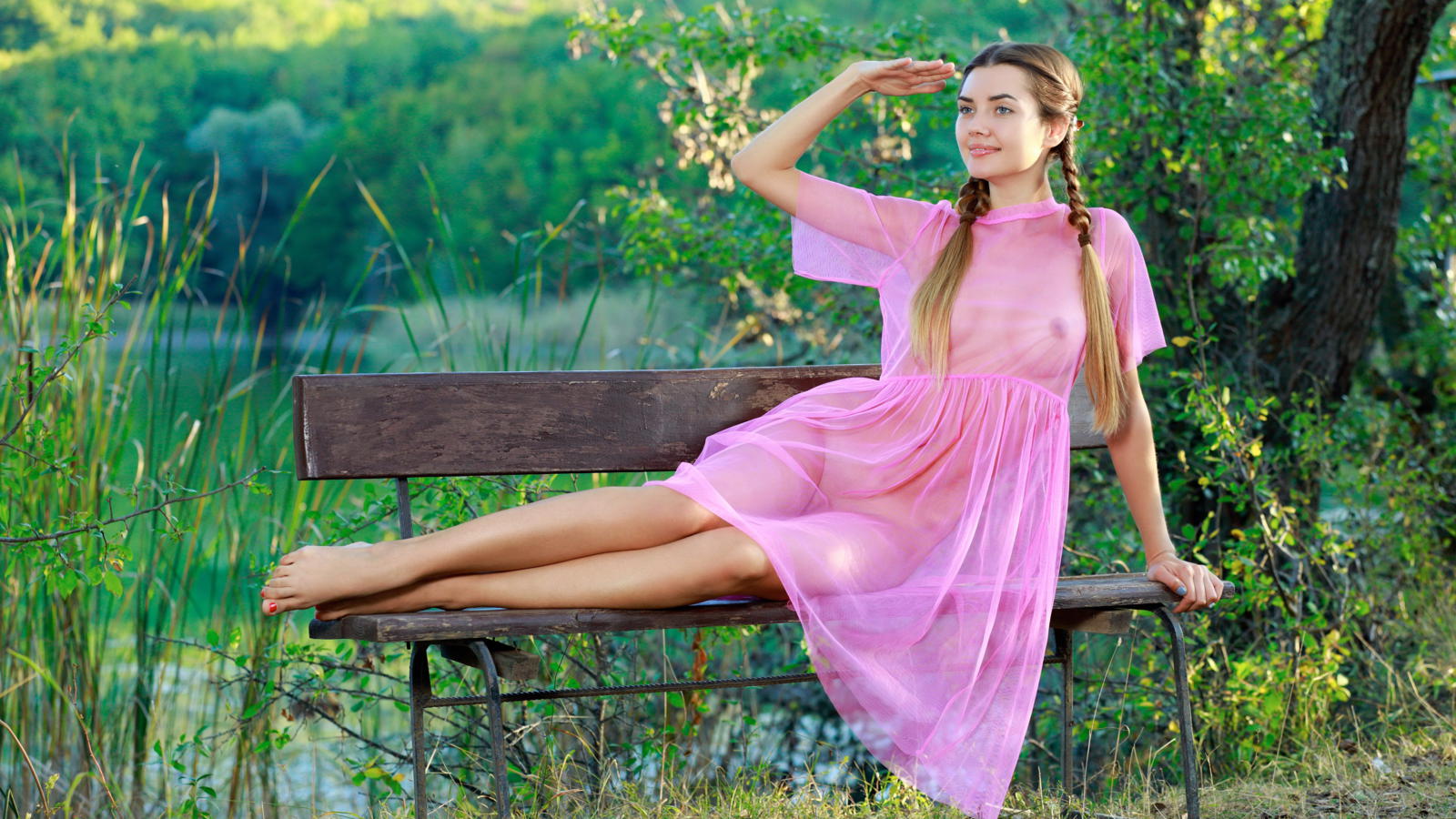 gorgia, viva, brunette, tanned, bench, tits, boobs, nipples, big tits, smile, see through, shaved pussy, sheer