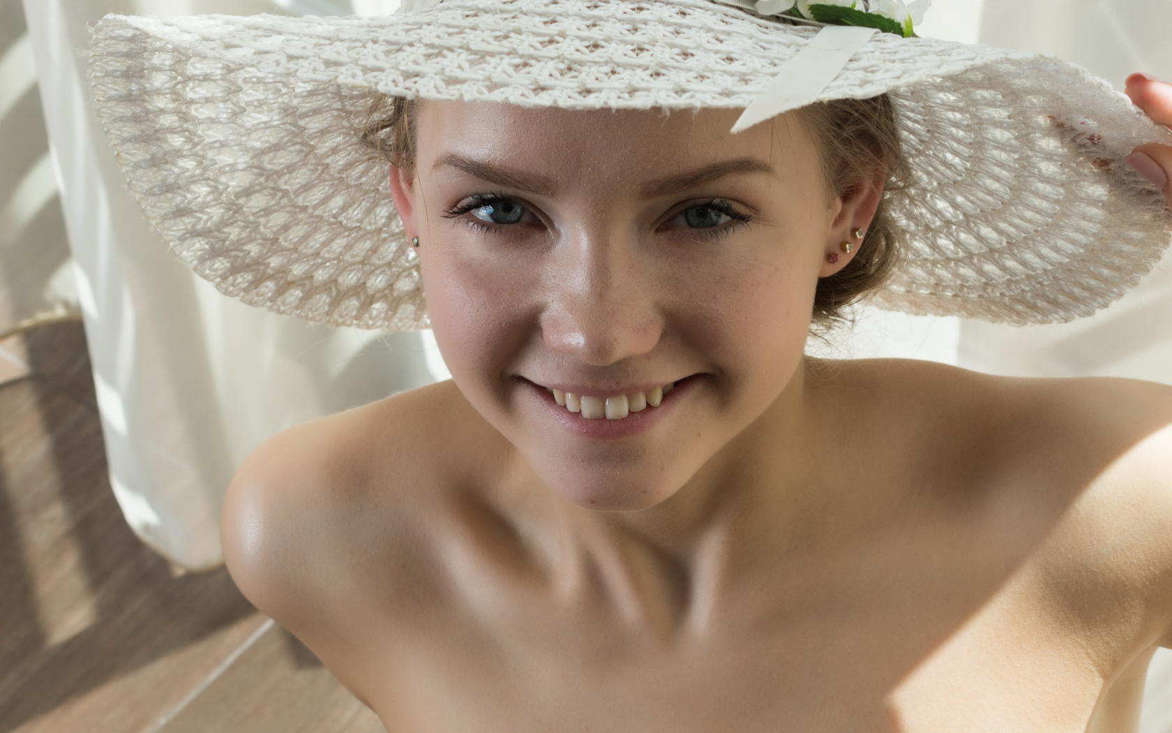 faina bona, puffy nipples, cute face, smile, hat, face