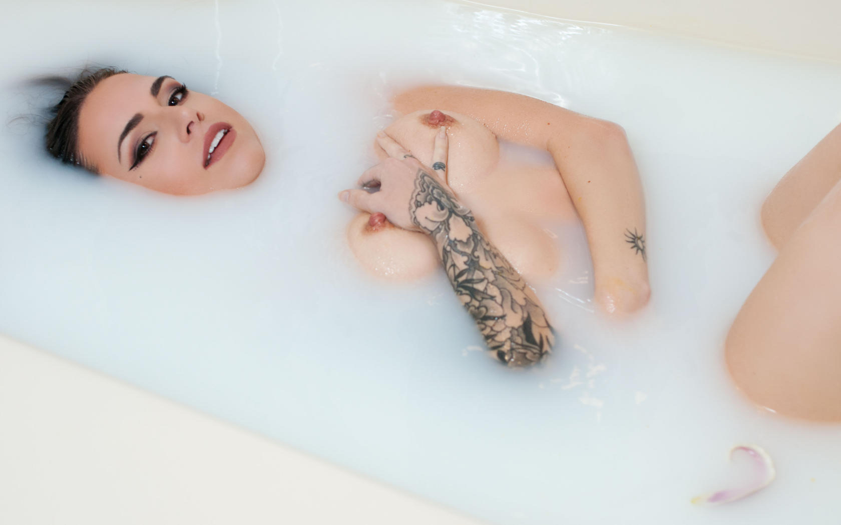 suttin, suicide girls, brunette, wet, bathroom, bathtub, hard nipples, nipples, tits, tattoo