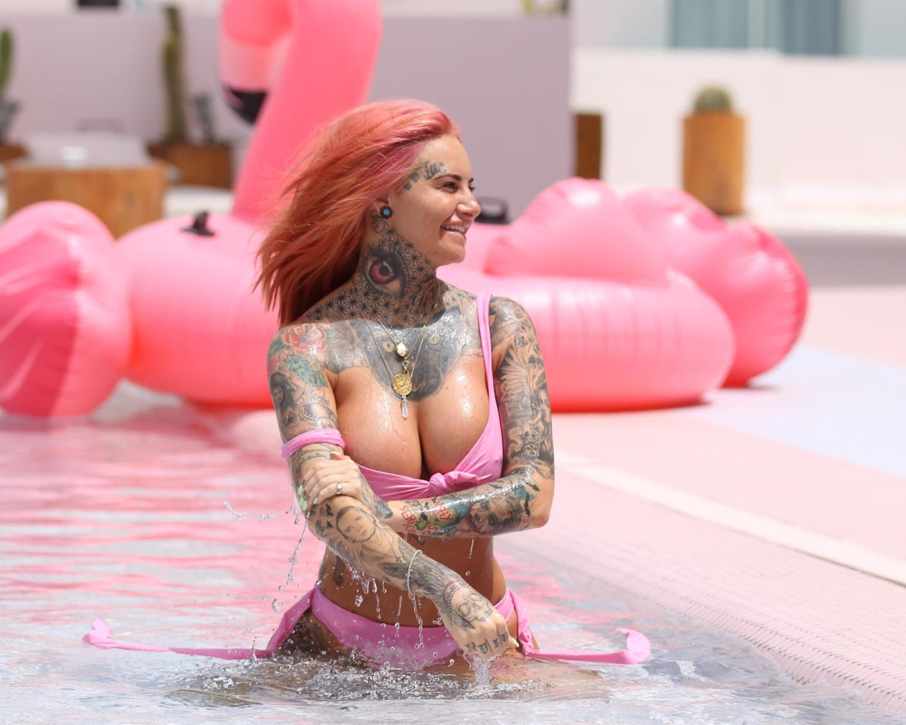 jemma lucy, pink hair, tattoo, bikini, wet, boobs, big tits, pink bikini, pool