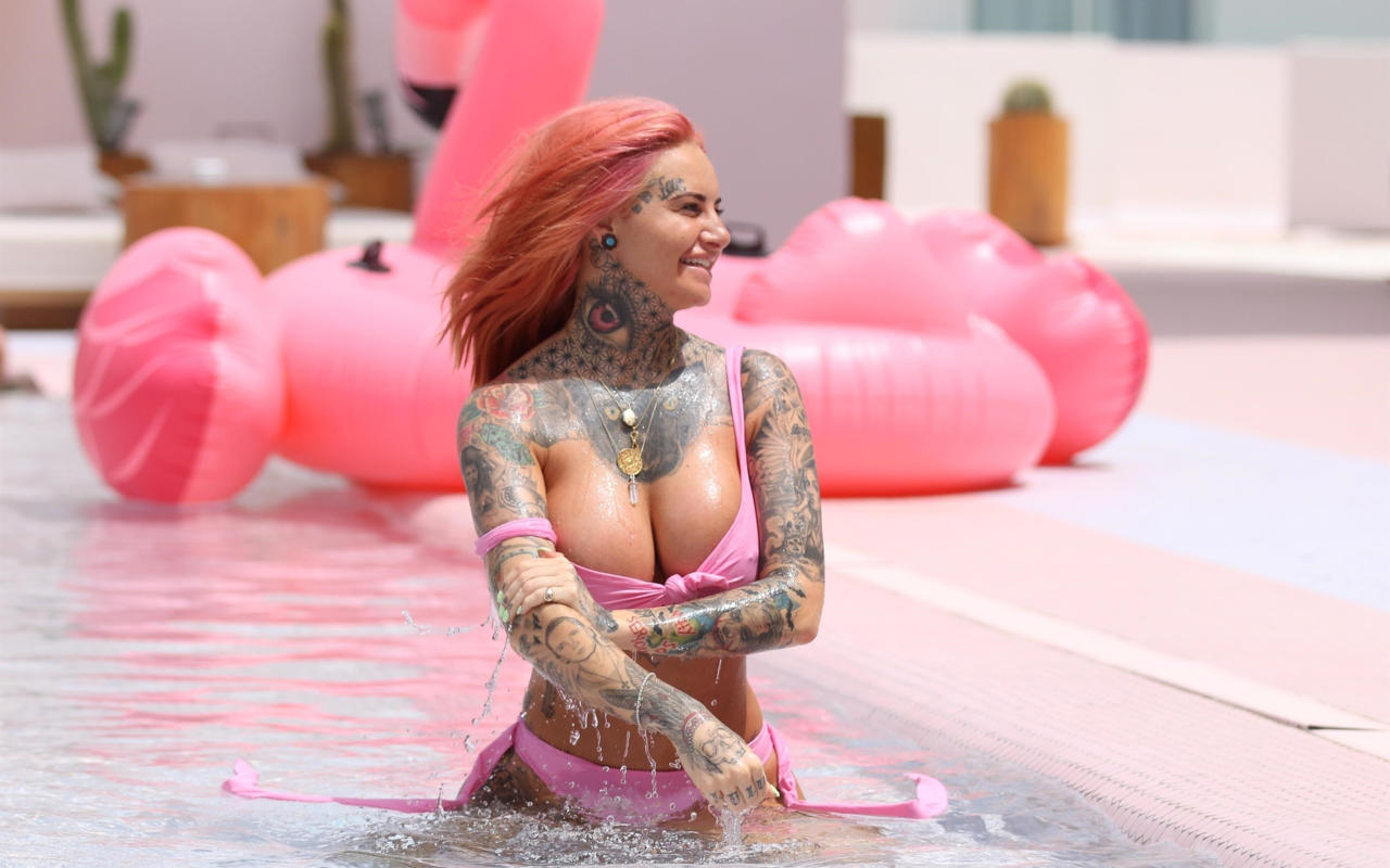 jemma lucy, pink hair, tattoo, bikini, wet, boobs, big tits, pink bikini, pool