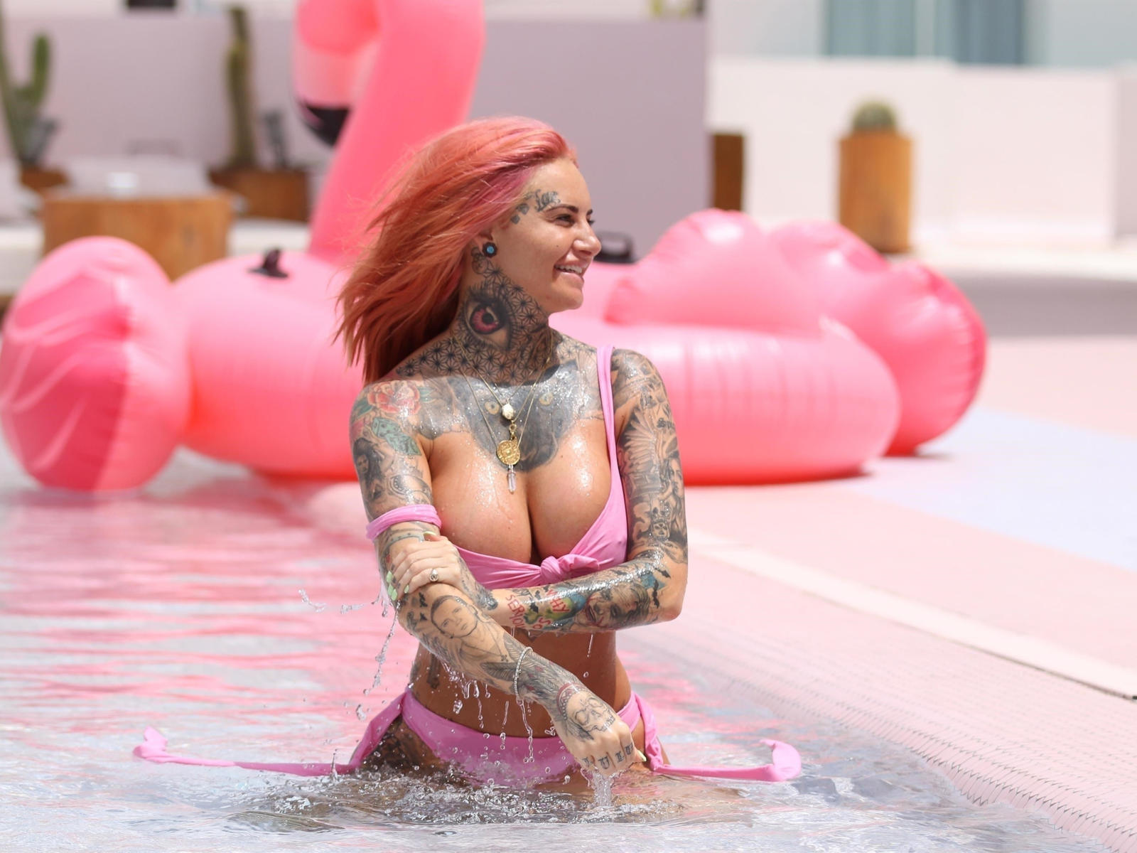 jemma lucy, pink hair, tattoo, bikini, wet, boobs, big tits, pink bikini, pool